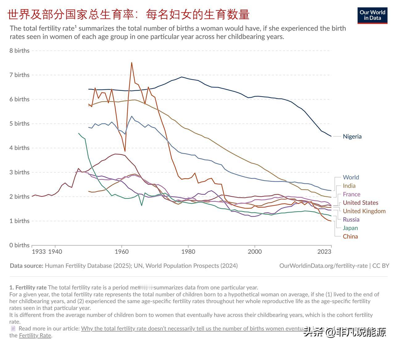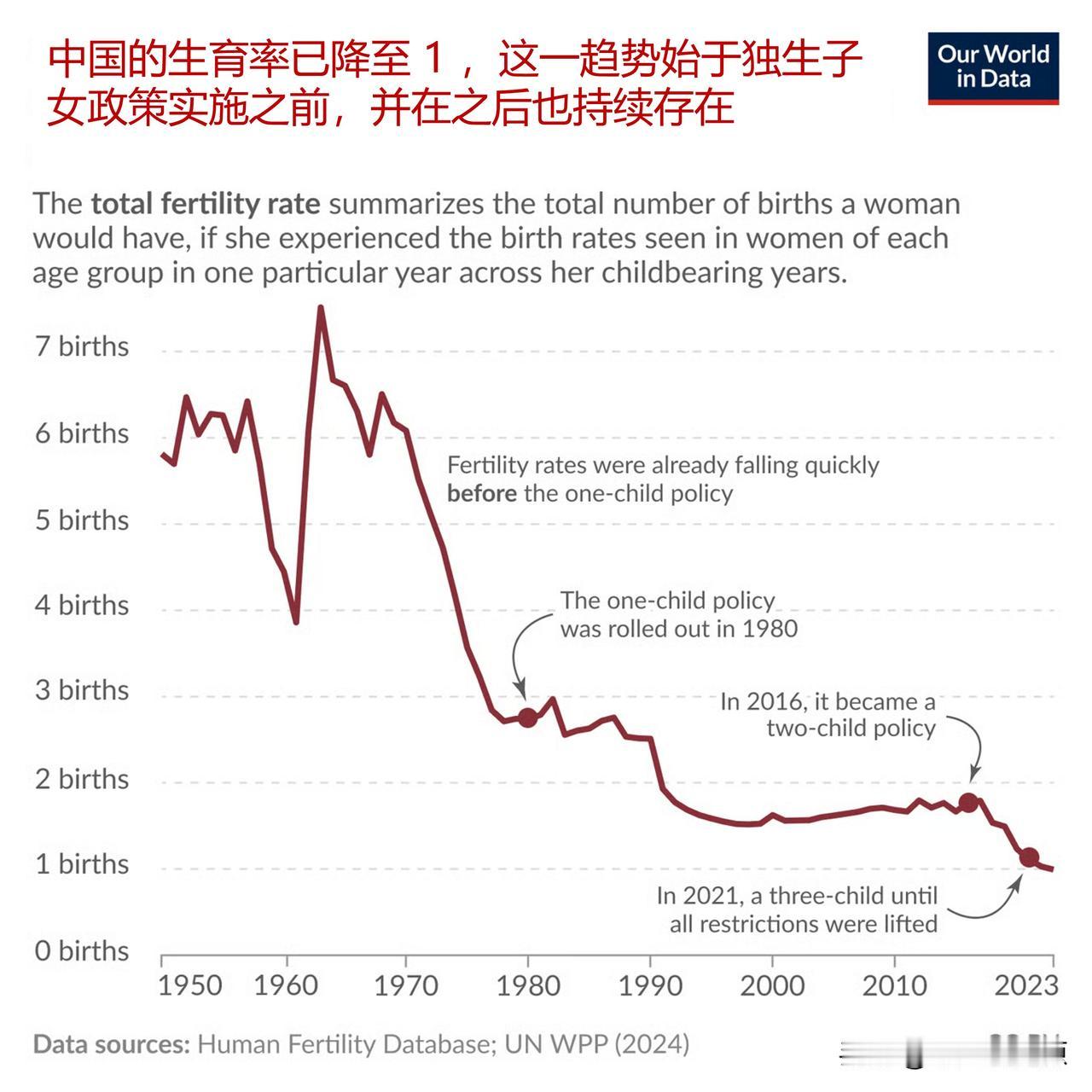 中国的生育率已降至 1 ,这一趋势始于独生子女政策实施之前,并在之后也持续存在 20 世纪 70 年代是一个深受人口过剩担忧影响的十年。作为世界上人口最多的国家,中国从未远离这场争论。1979 年,中国制定了独生子女政策,并于 1980 年在全国范围内实施,旨在通过限制一对夫妻只能生育一个孩子来控制人口增长。 到那时,中国的生育率(即每名女性所生育的子女数量)在 20 世纪 70 年代初就已经迅速下降了,这一点从下面图表中可以看得很清楚。 尽管中国的独生子女政策限制了许多家庭,但也有例外情况。该政策的执行力度因省份不同以及城乡差异而大不相同。如果第一胎是女孩,许多夫妇被允许再生育一个孩子。而其他夫妇若生育超过一个孩子则需缴纳罚款。因此,生育率从未降至接近 1 的水平。 在过去几年里,尽管 2016 年中国取消了独生子女政策,且政府鼓励大家生育更多孩子,但生育率却降至 1。如今生育率的下降更多是由社会和经济变化所导致,而非政策因素。 下面图表展示了中国总生育率变化情况,这一数据也受到女性推迟生育年龄的影响。而“同龄组生育率”则能反映平均每位女性在其一生中实际会生育的子女数量。在中国,这一同龄组生育率的数值很可能高于 1,但仍然处于较低水平,因此人口仍将持续减少。