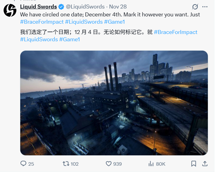 【《正当防卫》新工作室将在下月公布新游戏】由《正当防卫》联合创办人克里斯多福·桑德伯格成立的 Liquid Swords工作室近日在推特上官宣,将于12月4日公布新游戏。