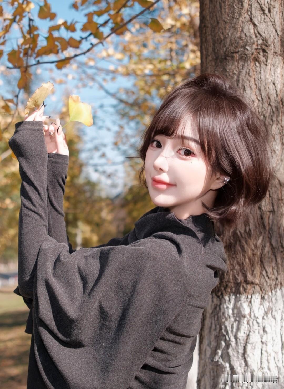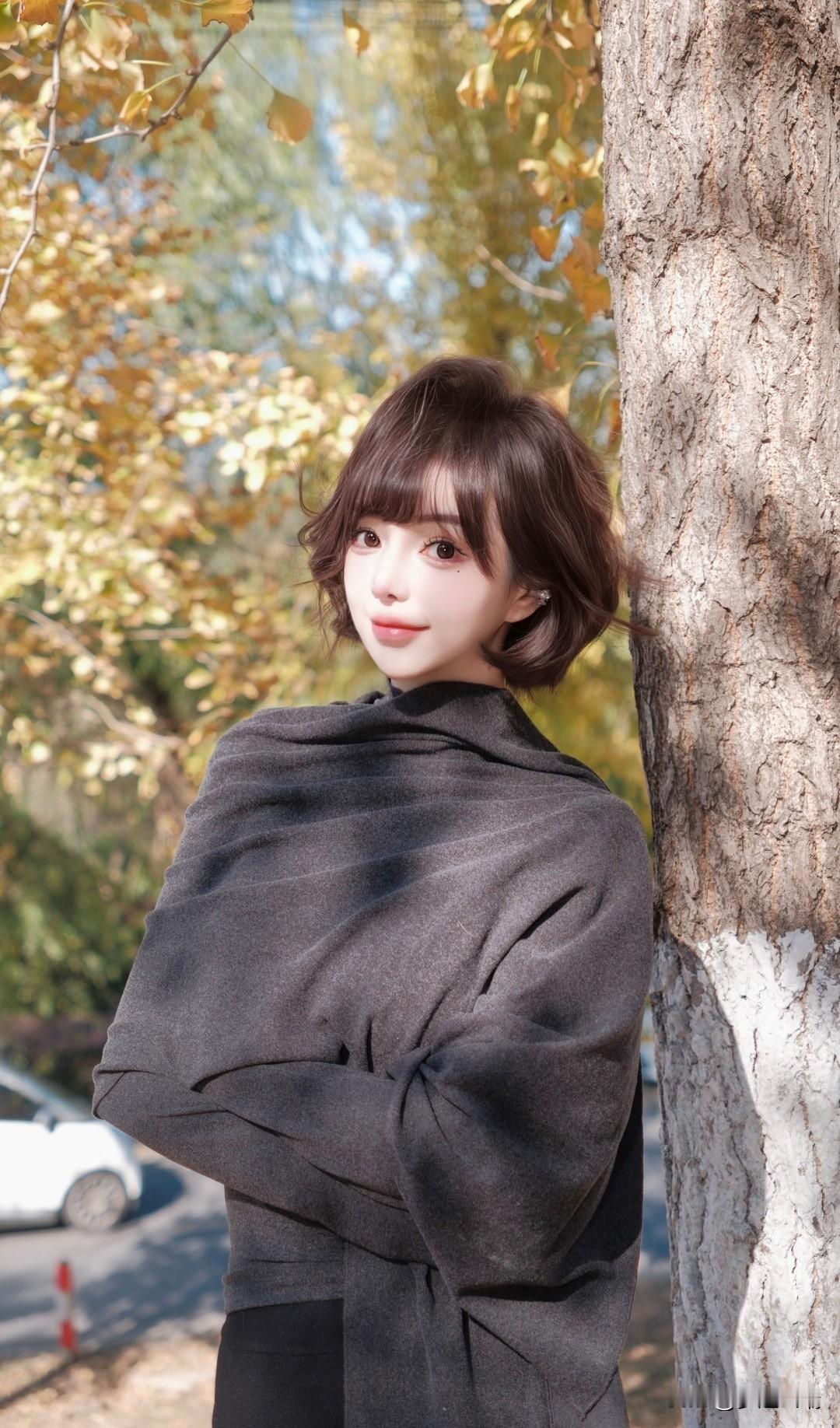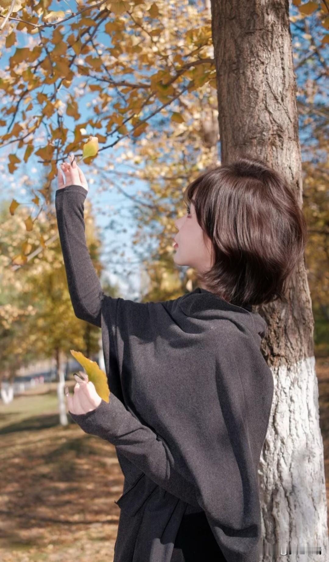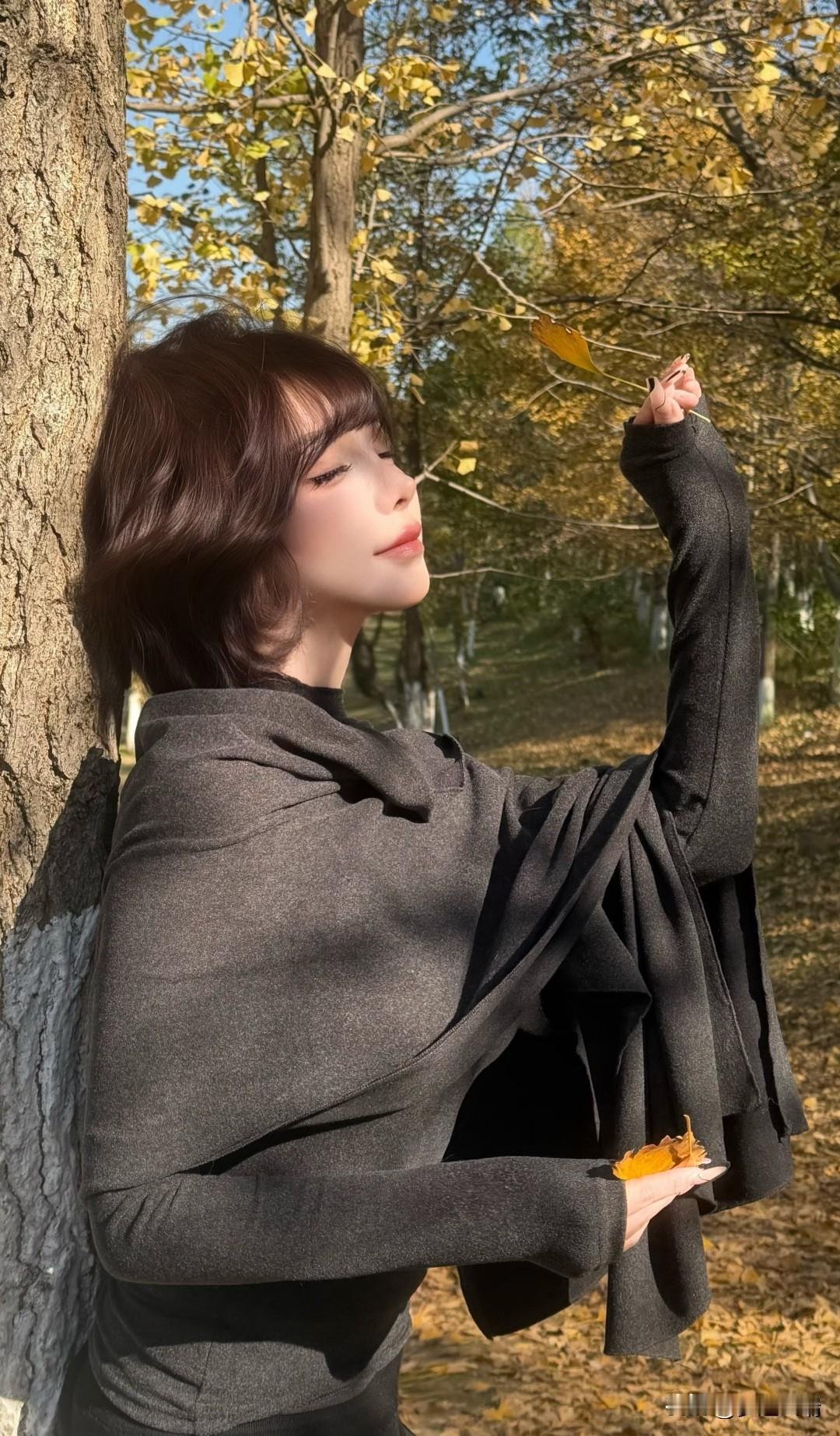 秋日暖阳下,树影婆娑,她倚树而立,优雅动人。