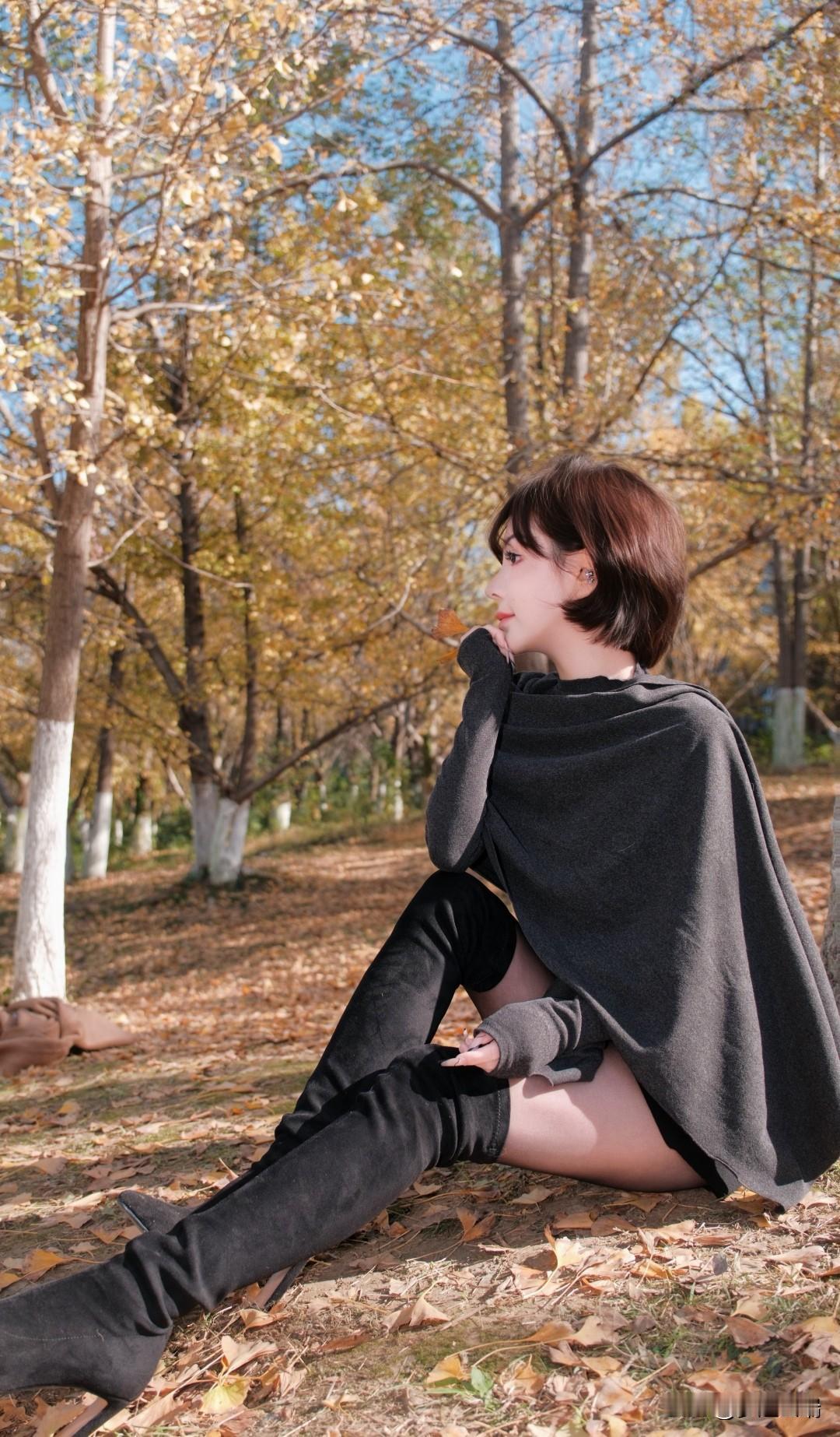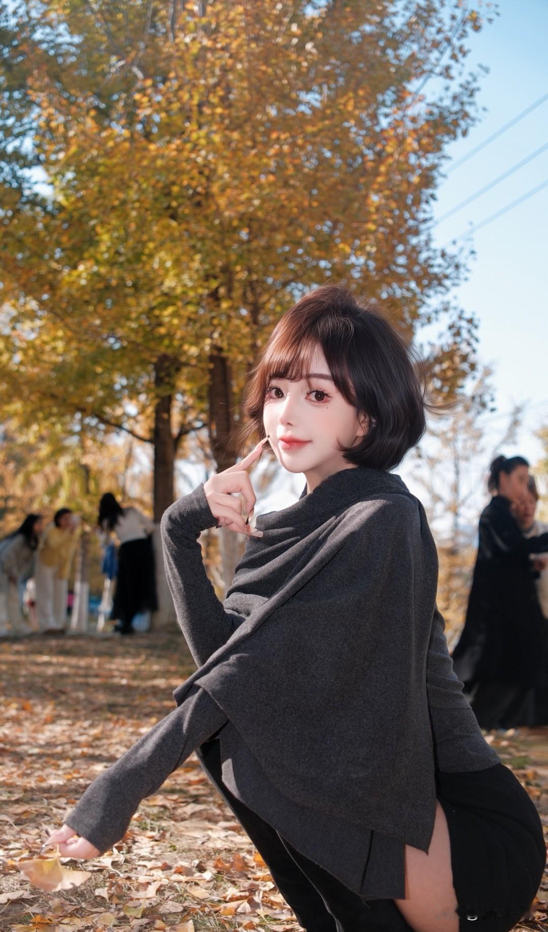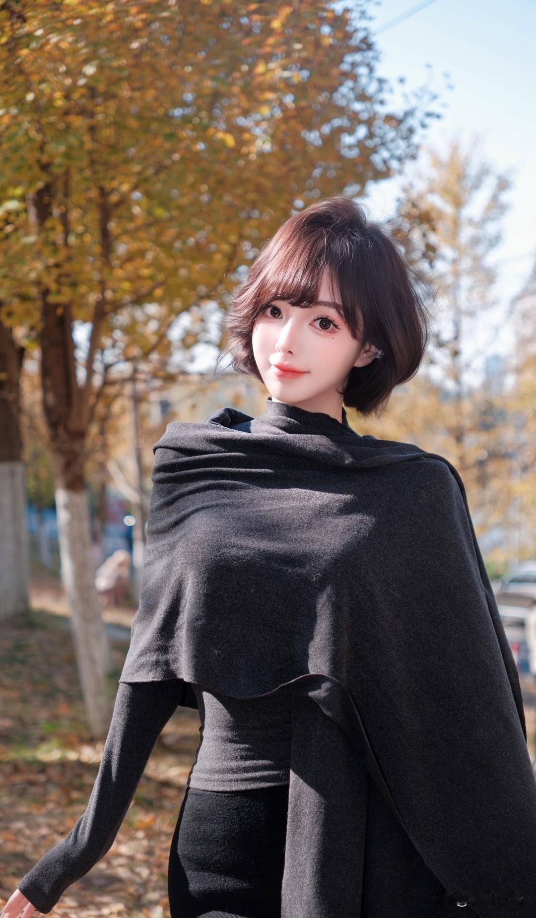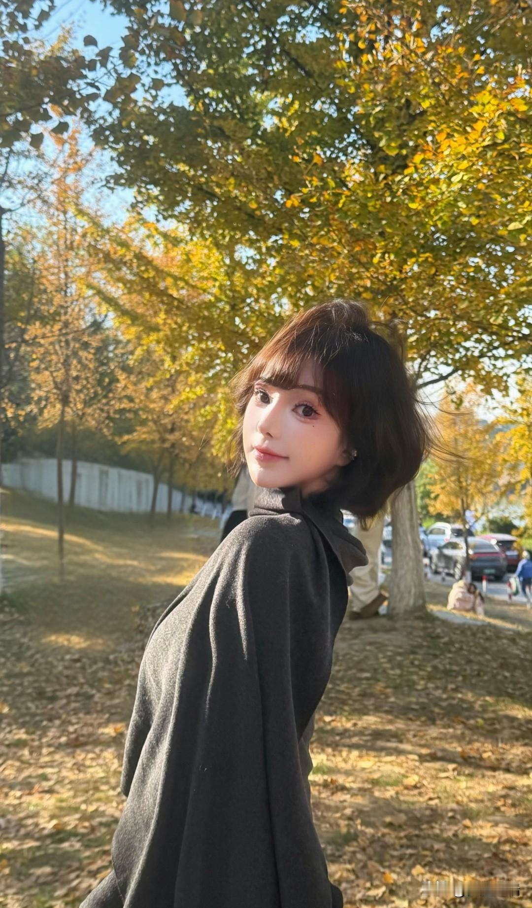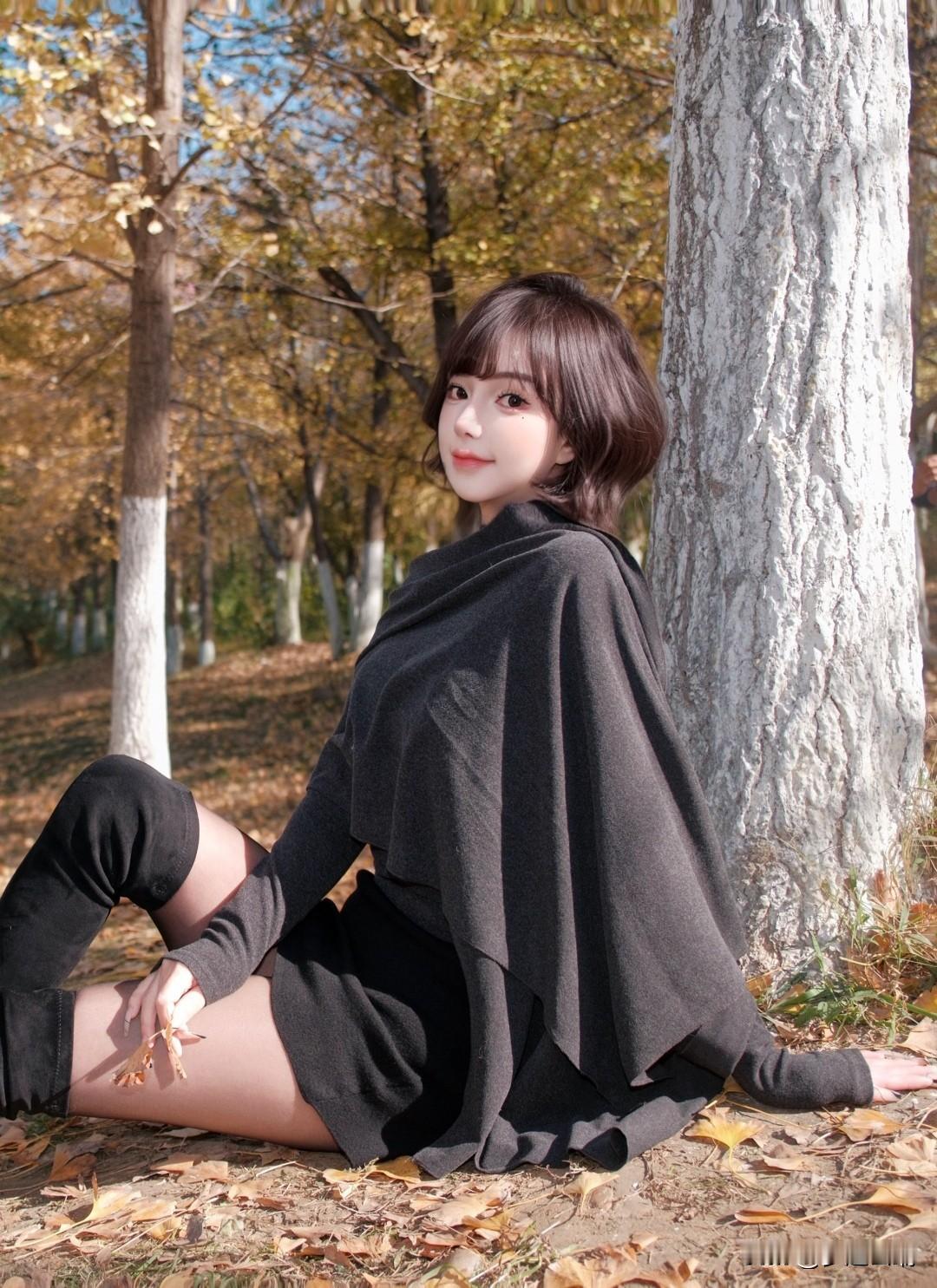 秋日暖阳下,树影婆娑,她倚树而立,优雅动人。