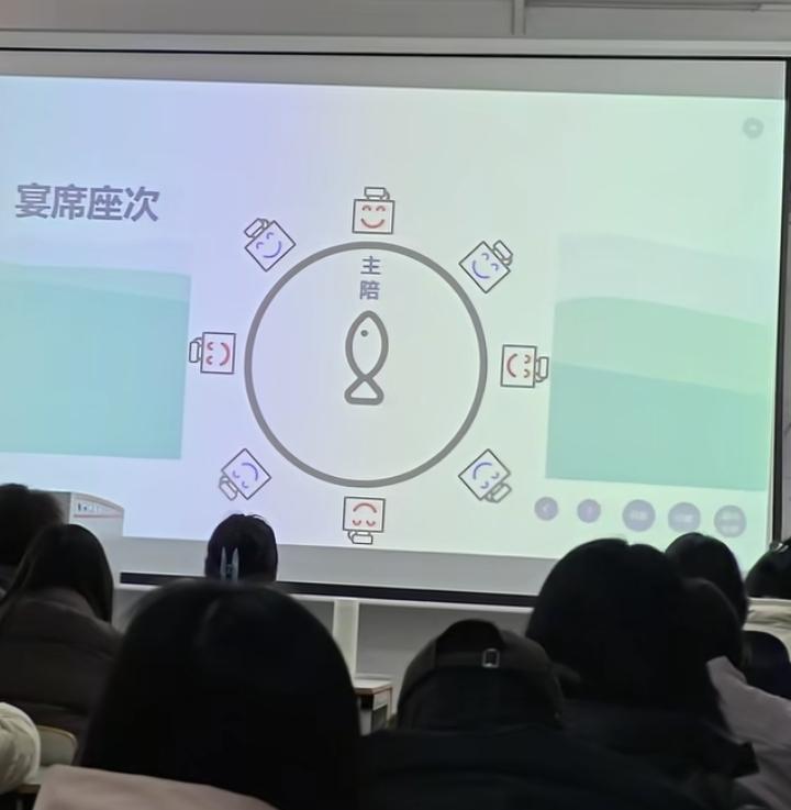 吃饭鱼头朝向要学一节课? 有没有山东的朋友出来证实一下,这是真的吗? 最近看网上有不少人发视频调侃餐桌礼仪,比如鱼头要朝向最长辈的人,本以为是搞笑,直到网友发出课堂视频。 这节课讲的就是宴席座次,什么主位、主陪、次陪,还有条鱼,鱼头冲着主位,据说还是必修课。