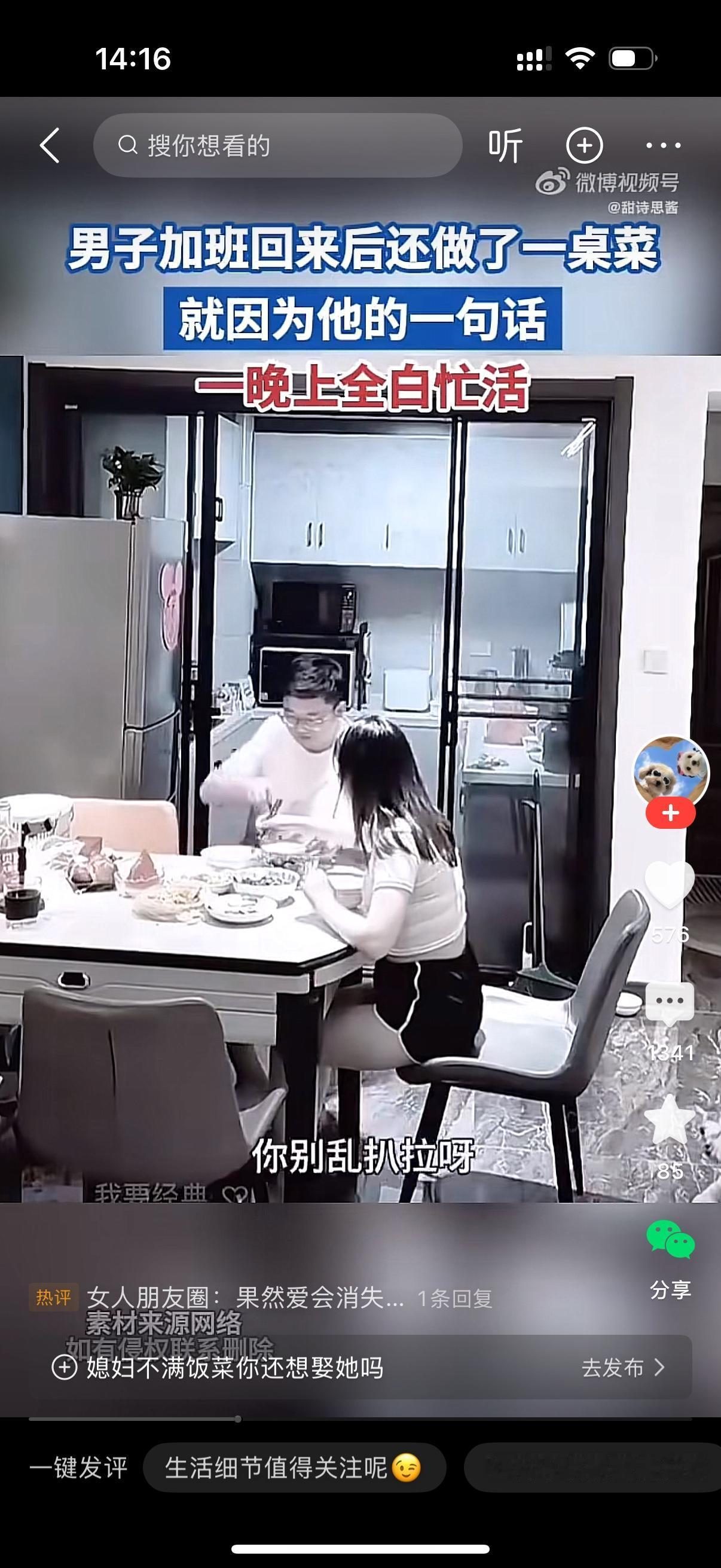 男子加班回到家做了一桌子菜。妻子拿着筷子扒来扒去。男子忍不住说她,别乱扒拉呀,这样不好。妻子说,我在家吃饭还这么多规矩吗?我就想找我自己想吃的。男人有点生气了,可以,都是你吃的。可是你这习惯很不好。女人也来脾气了,我父母从小都不说我。男人说,将来有小孩了,你就这样做榜样吗?妻子怒了,放下碗筷说,酸不拉唧的,一点味都没有,不吃了。男人看着妻子走开,内心五味杂陈。女人真是不能太惯。