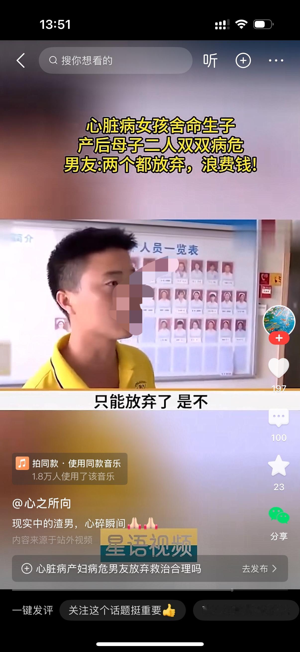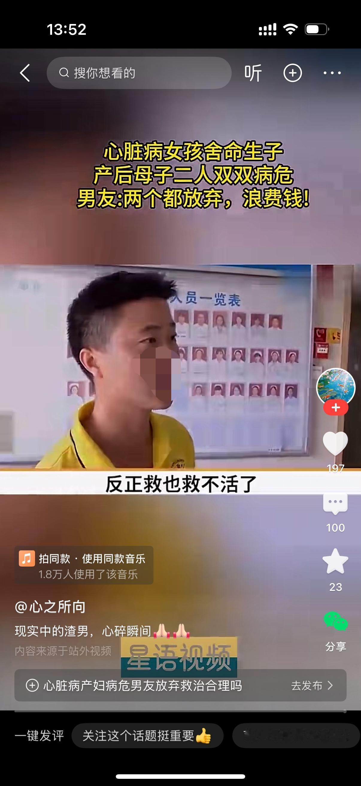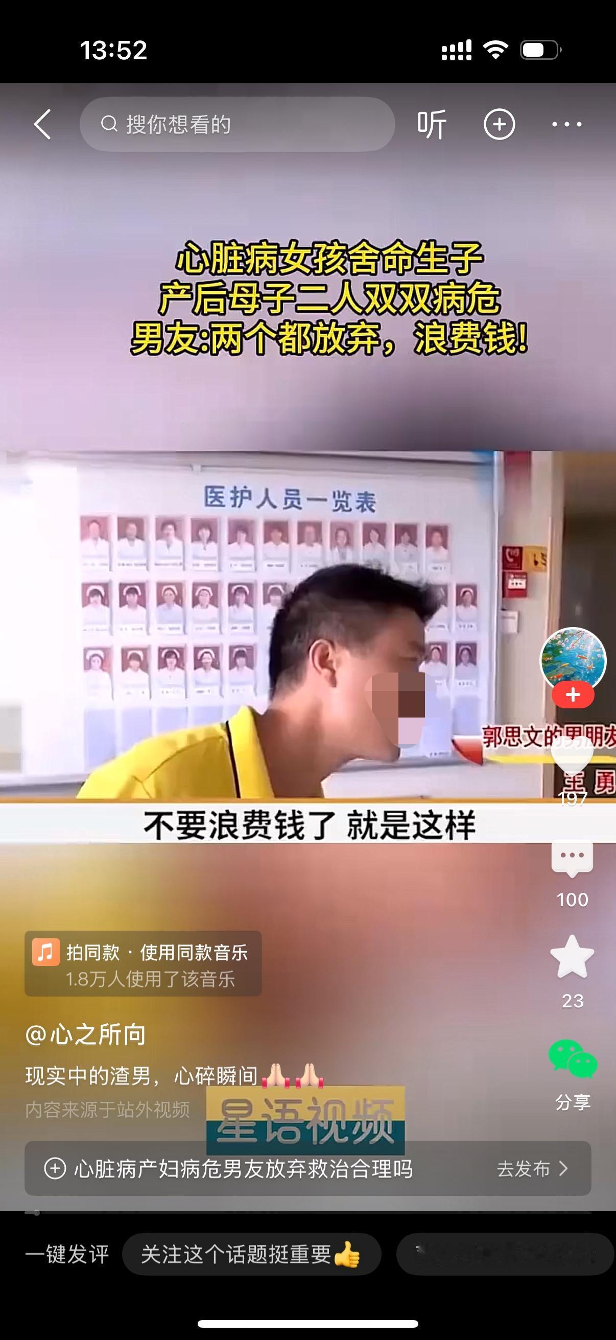心脏病女孩舍命生子,产后母子二人双双病危。男友跟医生说,反正救也救不活了,不要浪费钱了,就是这样,只能放弃了,是不?医生说,如果你有100万,还是可以搏一搏的。男友却说,别提100万了,就算10万,我也要考虑救不救。真是稀奇,一个未婚的男友而已,他有什么权力决定女人和小孩的生死,这不是女人父母来做决断吗?