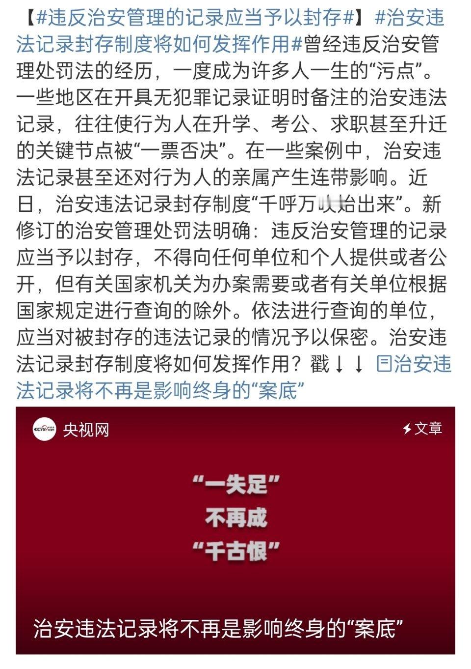 违反治安管理的记录应当予以封存这条热搜其实是6月份的一条新闻,当时没多少热度,现在又重新翻出来了。【治安违法记录将不再是影响终身的“案底”】