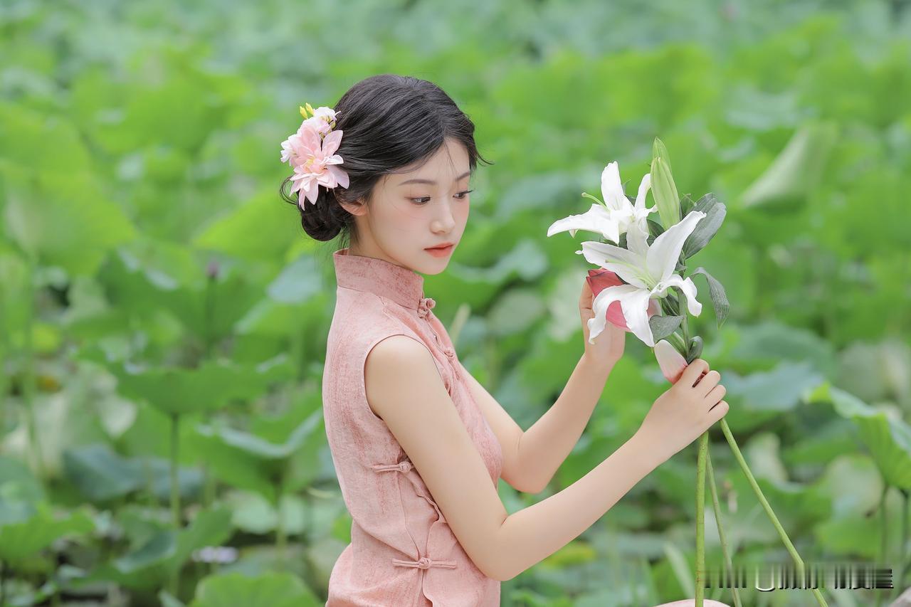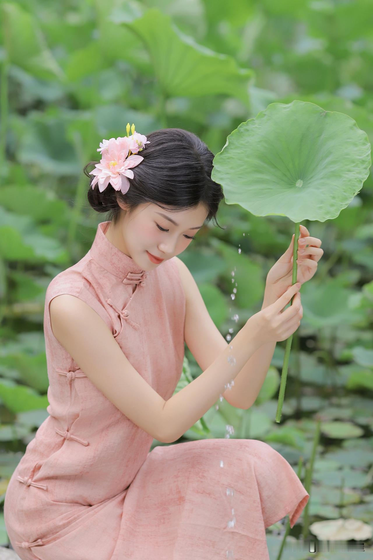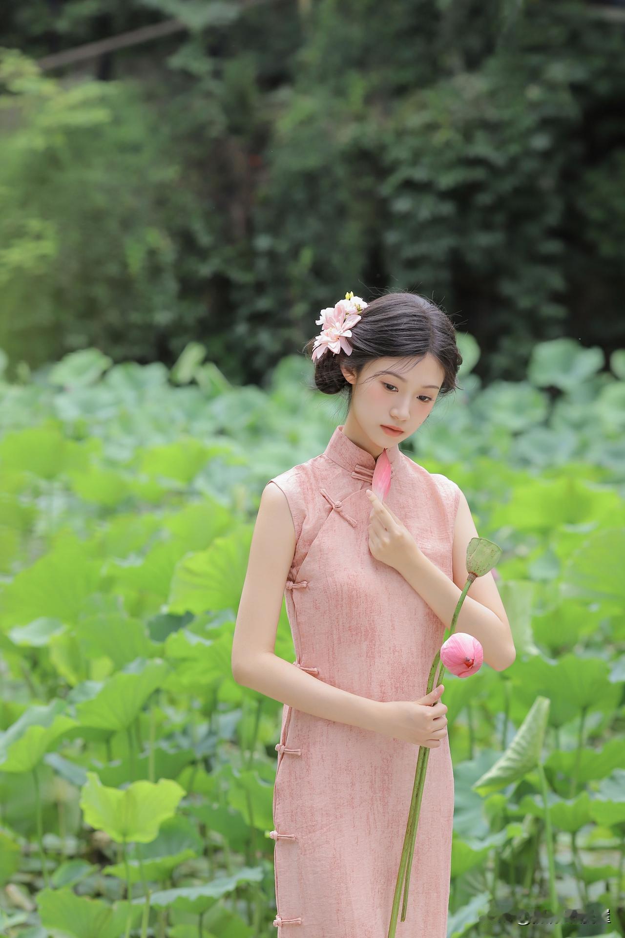 看到“粉衣少女立荷塘,花影摇曳似画中”,瞬间就有画面感了。想起李兰迪穿米白水墨牡丹绣旗袍在荷塘月夜的场景,那简直美炸了。丝缎材质像被月光镀亮的云锦,米白色调衬得人明艳贵雅,水墨牡丹绣藏着国风奢华,钻饰镶边又添贵气细节。她持扇行于荷畔石径,月光在荷尖流转,牡丹在袍上静绽,旗袍丝滑与夜景交叠,仿佛从画里走出。粉衣少女站在荷塘与这场景类似,旗袍与荷塘搭配,营造出沉浸式贵雅梦境,真是贵雅诗意天花板!