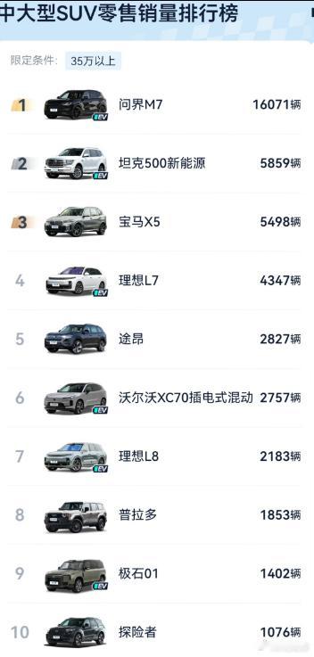 问界M7成35万级中大型SUV销冠10月全新问界M7的销量可以呀,16071辆并成为10月35万级中大型SUV销量榜销冠,甚至超过了榜单上2—4名的销量总和,这里面还有我们团队的一份功劳。不得不说,自从青岛降温,开全新问界M7出门是真挺舒服的,空调远程预热、座椅加热上车,车载冷暖箱,主打一个暖和!问界M7月销量超同级2至4名总和