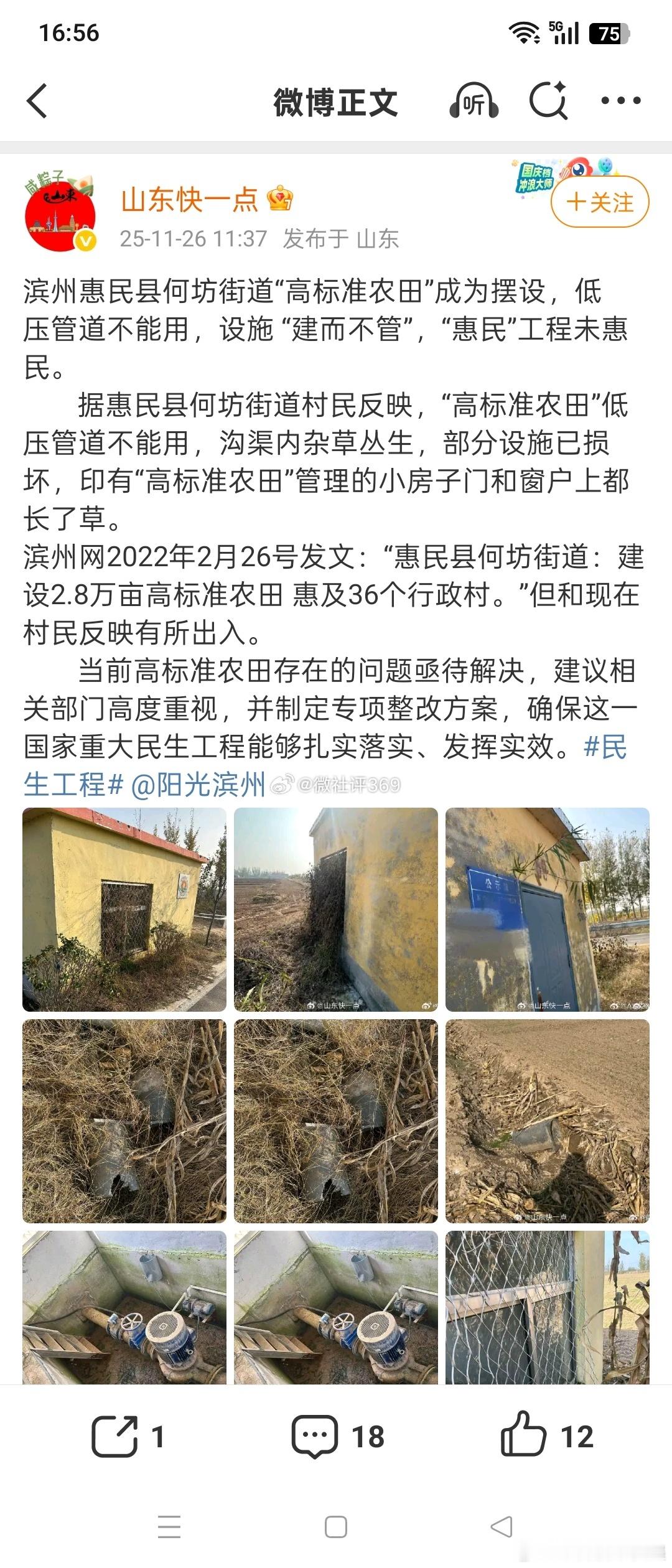 滨州惠民县何坊街道“高标准农田”成为摆设,低压管道不能用,设施 “建而不管”,“惠民”工程未惠民。 据惠民县何坊街道村民反映,“高标准农田”低压管道不能用,沟渠内杂草丛生,部分设施已损坏,印有“高标准农田”管理的小房子门和窗户上都长了草。滨州网2022年2月26号发文:“惠民县何坊街道:建设2.8万亩高标准农田 惠及36个行政村。”但和现在村民反映有所出入。 当前高标准农田存在的问题亟待解决,建议相关部门高度重视,并制定专项整改方案,确保这一国家重大民生工程能够扎实落实、发挥实效。民生工程