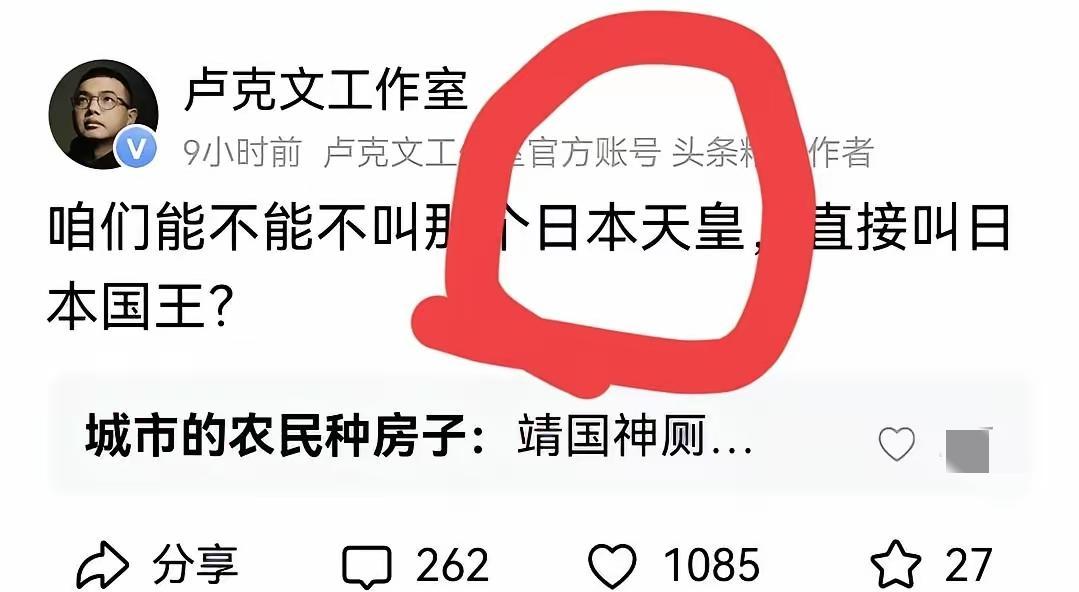 卢克文的这个建议可以封神。 以后国内对日本的统治者不要称“日本天皇”,最多他也就是我们封的一个王。可以叫他“日本王”。 这建议真不是抠字眼,是戳中了关键!“天皇”二字带着虚假的至高感,当年日本军国主义就是借着这名号煽动侵略,本质就是自抬身价。 弹丸之地的君主,凭啥碰瓷“天”字?叫“日本王”既符合实际,又暗戳戳打破了他们的精神优越感,这才是软刀子见真章。 别觉得这是小事,语言里的话语权很重要。我们不主动挑事,但也不能让他们拿着虚假名号摆架子。 这种精神上的精准反击,比空喊口号管用多了。你觉得“日本王”这称呼贴切吗?还有更解气的叫法吗?来评论区聊聊~