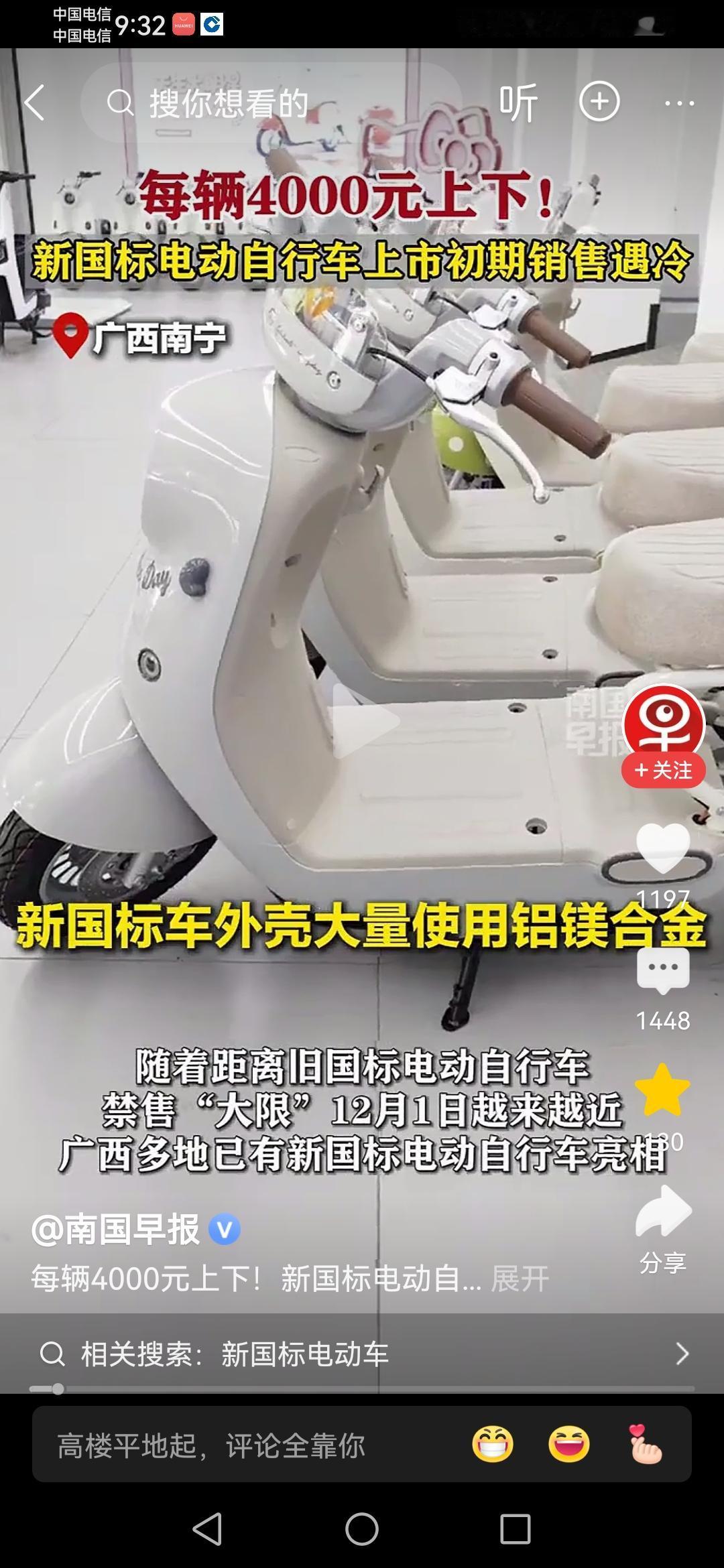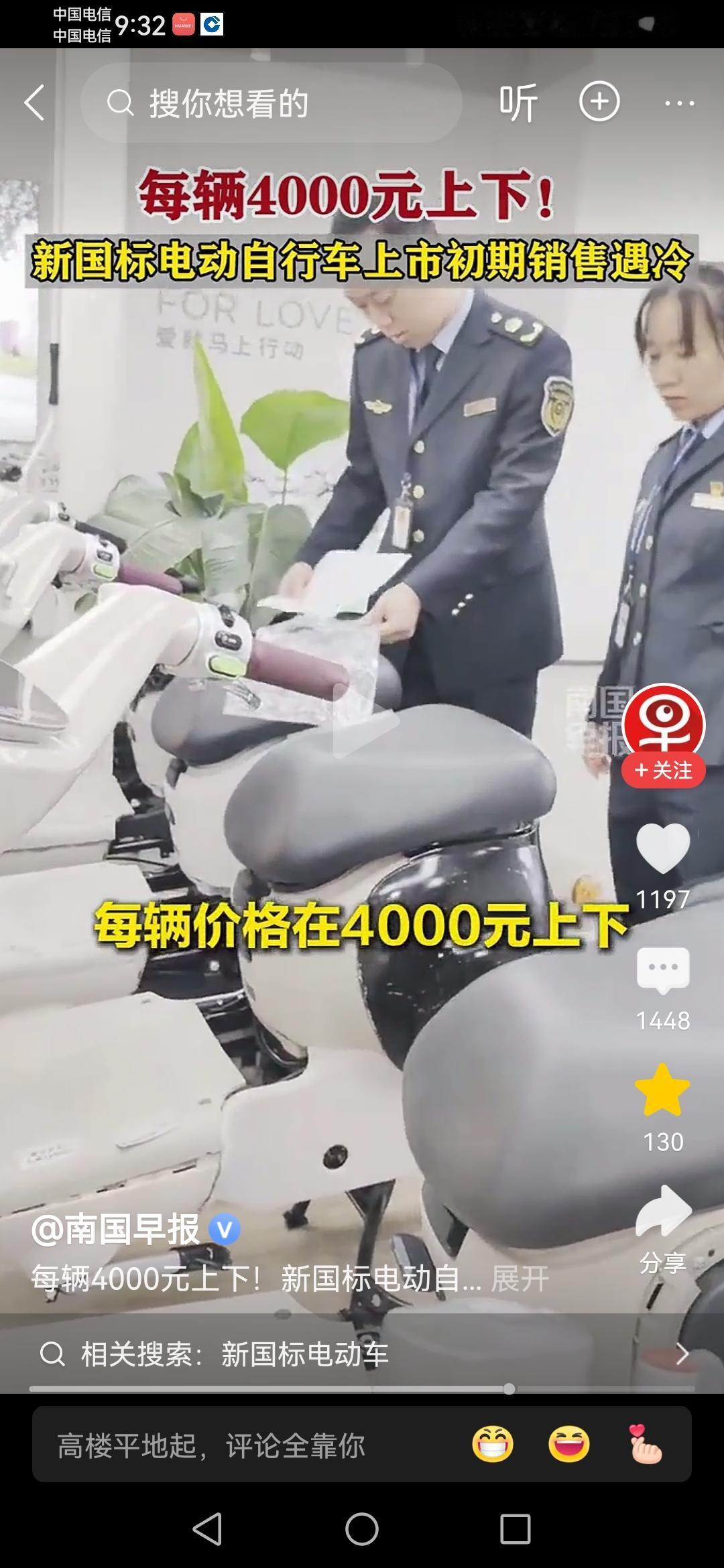 又慢又贵但足够安全! 这样的新新国标车,大家会买单吗? 12月1号开始,全新的电动自行车新国标正式开始执行,意味着超过3亿辆的旧国标车,以后在销售点就买不到了! 塑料件改成铁的或者镁铝合金的,有北斗定位和电池监测系统,不怕车子丢了或者被偷了找不到,时速只有25公里每小时,大家开在路上又慢又安全,生命安全有保障了。 只是开价4000以上的价格,因为新新国标车上架的比较少,是真心有点贵了,毕竟旧国标3000块左右的车子的配置就已经相当的不错了啊。 就不知道大家对于新车又是怎么看呢?电动车规定 新电动车新规