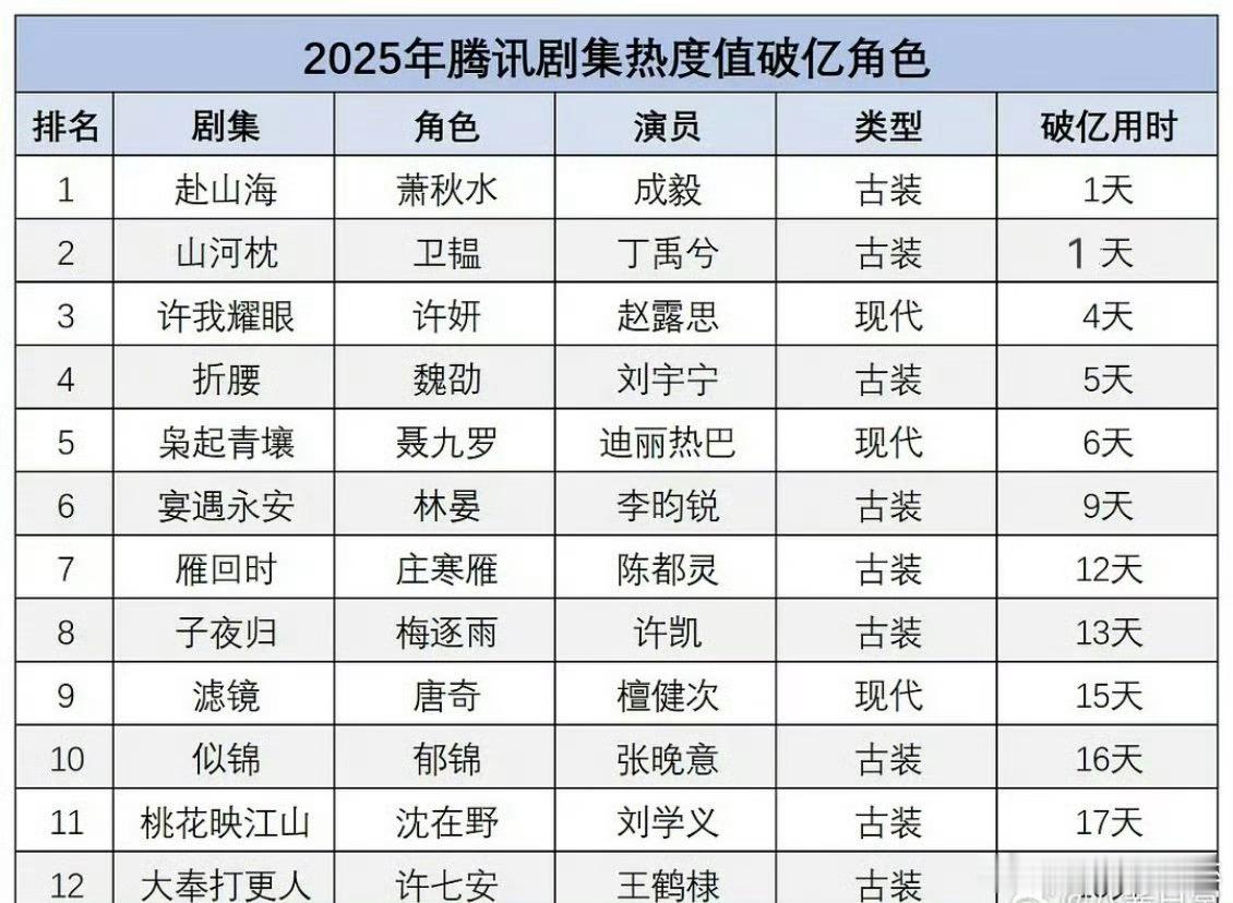 腾讯2025年热度破亿角色腾讯视频2025年剧集热度破亿角色,你最喜欢哪个角色? 《赴山海》:萧秋水(成毅)《许我耀眼》:许妍(赵露思)《折腰》:魏劭(刘宇宁)《枭起青壤》:聂九罗(迪丽热巴)《宴遇永安》:林宴(李昀锐)《雁回时》:庄寒雁(陈都灵)《子夜归》:梅逐雨(许凯)《滤镜》:唐奇(檀健次)《似锦》:郁锦(张晚意)《桃花映江山》:沈在野(刘学义)《大奉打更人》:许七安(王鹤棣)全网热点共创计划