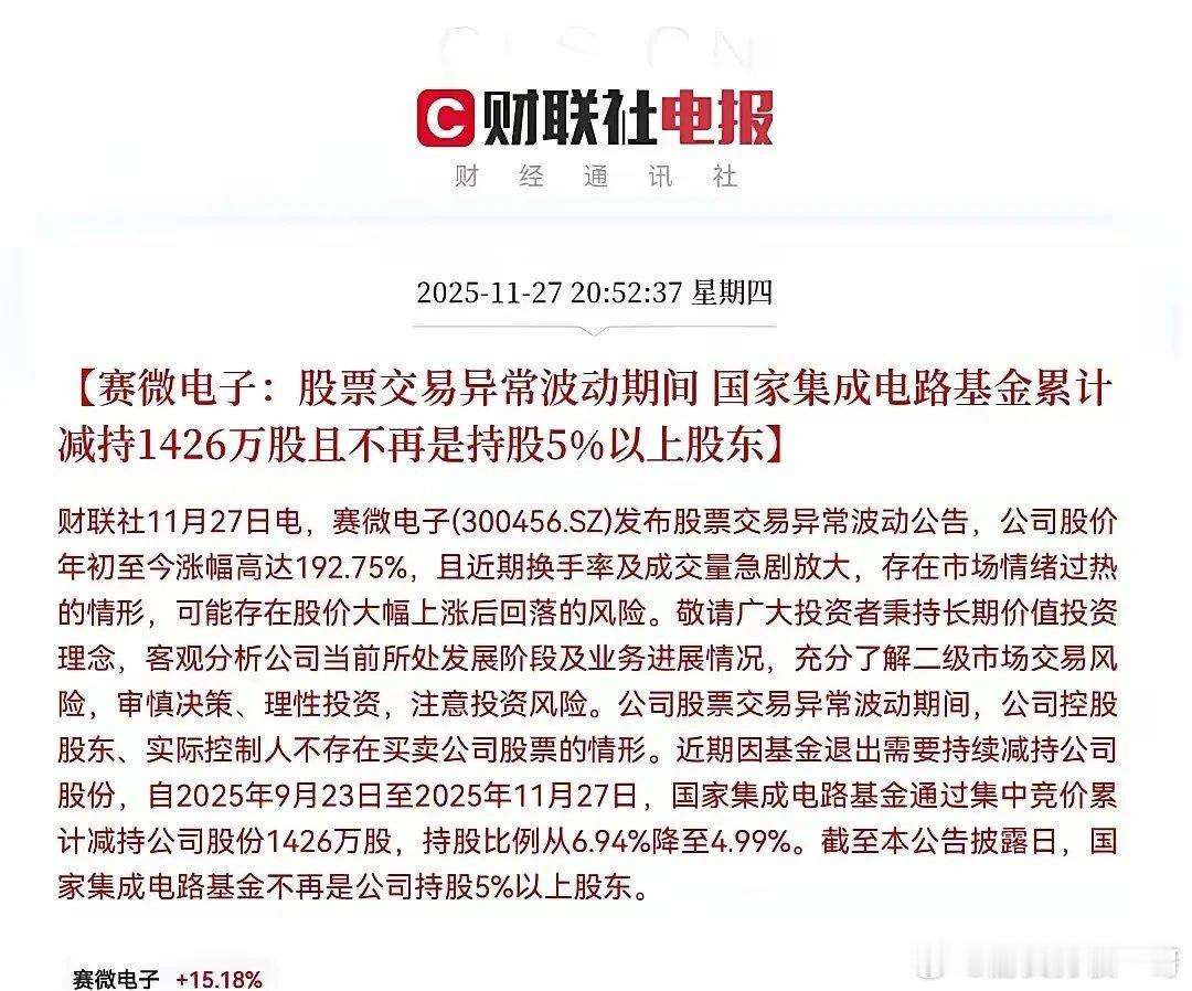 赛微这样的坑还是要避一下!赛微电子突发公告,公司持股5%以上股东国家集成电路产业投资基金股份有限公司因基金退出需要,两天减持了642.78万股,持股比例由5.88%下降至4.999986%。以后减持不用公告了,小心吧