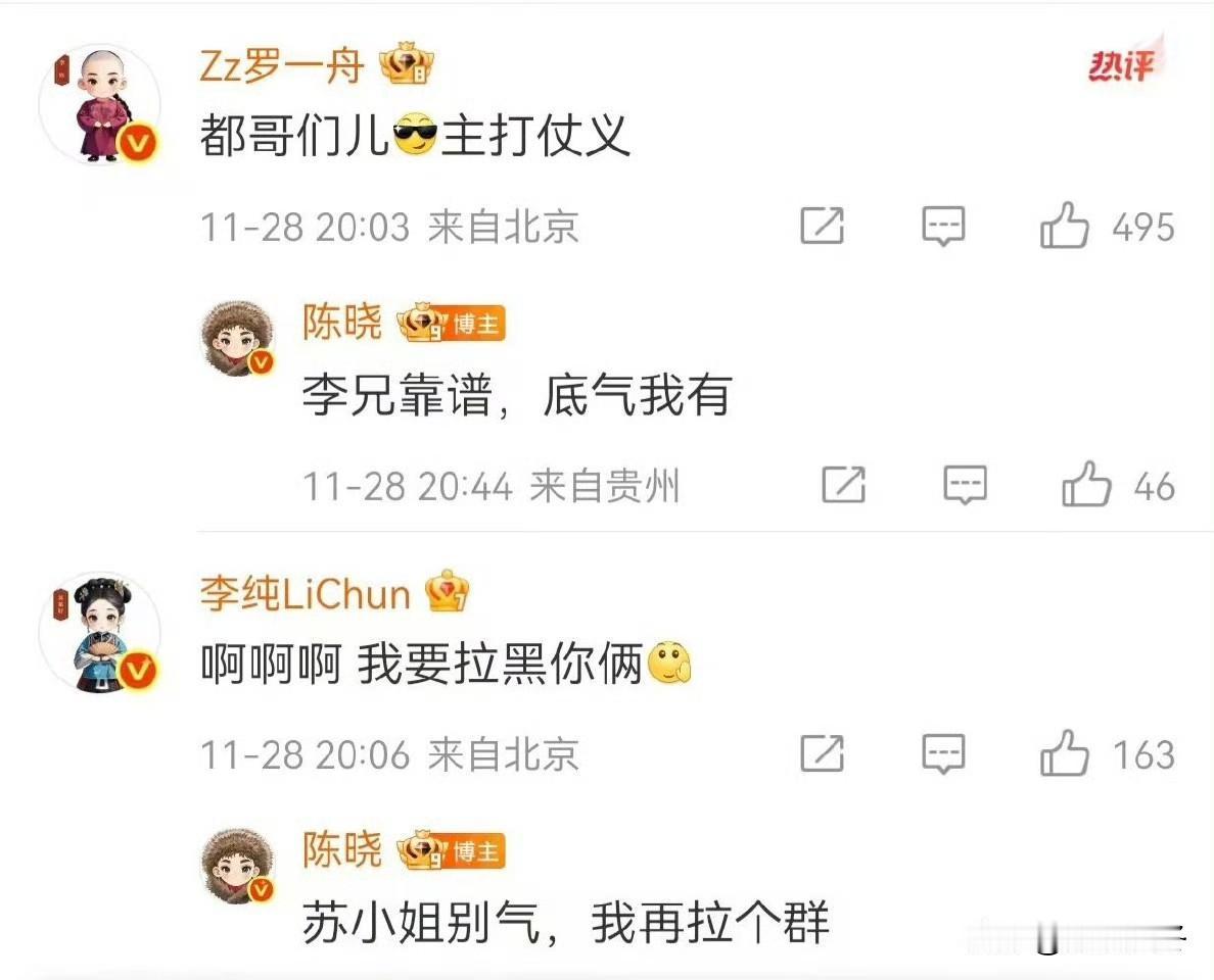 陈晓饰演的古平原被“踢”出群聊![捂脸] 你让我们男一号的脸往哪搁,就这样被踢啦[捂脸]苏小姐脾气就是大呀,果然是个狠角色,李钦也是爱莫能助呀! 点开聊天记录就看陈晓被踢出群聊,这到底是大生意人,还是大喜剧人!昨天晚上追更的时候就被拍卖那段逗不行了,刚刚刷到陈晓的微博更是笑发财了,没成想评论区还能战争升级。 三个的人互动怎么能这么有梗,古平原、李钦还是太能整活了,主打一个兄弟开团我秒跟,真给苏紫轩整没招了。 陈晓的古平原已经够有趣了,加上罗一舟的李钦更是笑点翻倍。这两人在评论区一唱一和,把苏紫轩急得直跳脚,直接把两人拉黑了![捂脸]没想到苏小姐太有个性,瞬间被圈粉! 铁子们今晚准时追剧,继续看大生意人古平原古大哥智斗八大家!大生意人
