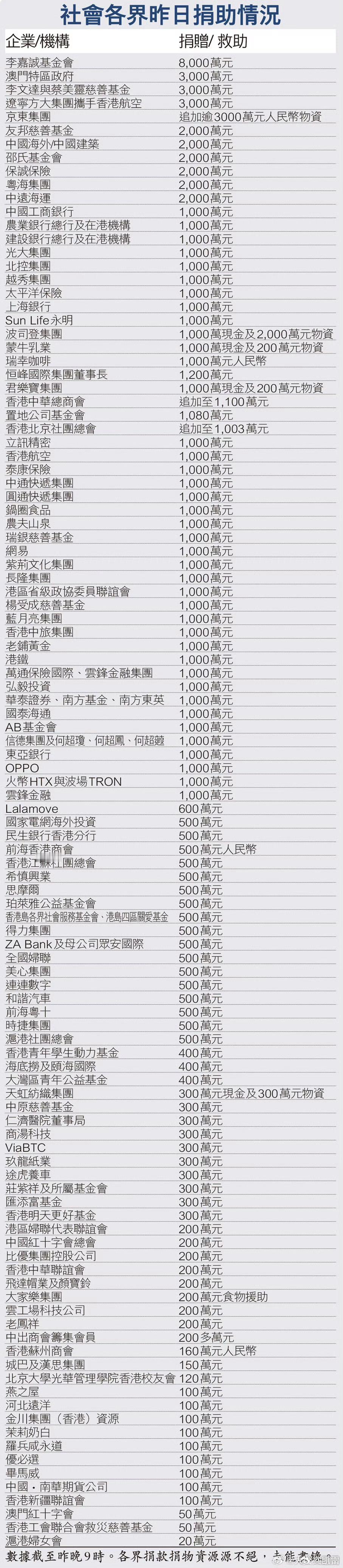 社会各界捐款捐物帮助香港大埔火灾受灾居民社会各界捐助名单持续更新(企业与演艺界)新增圆通快递 1000万 老铺黄金 1000万美心集团 500万海底捞及颐海国际 400万 庄紫祥及所属基金会 300万京东集团追加逾3000万人民币物资