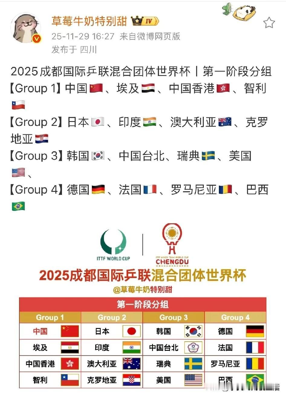 孙颖莎和王楚钦,肖战全程参与成都混团抽签。 第一阶段分组中国在第一小组,同组的还有埃及,中国香港和智利。看来中国香港有点悬了。 日本在第二小组,同组的有印度,澳大利亚和克罗地亚。这几个国家挡不住日本队。日本队是上上签。 韩国,中国台北,瑞典和美国抽到第三小组。韩国有点手背碰到了中国台北。因为瑞典莫雷加德的缺席,台北男队有希望出线。 第四小组绝对是硬碰硬的下下签。德国,法国,巴西和罗马尼亚强强相遇。男团法国是欧锦赛的冠军。女团德国是冠军。这两个国家的比赛一定好看。千万不要错过。