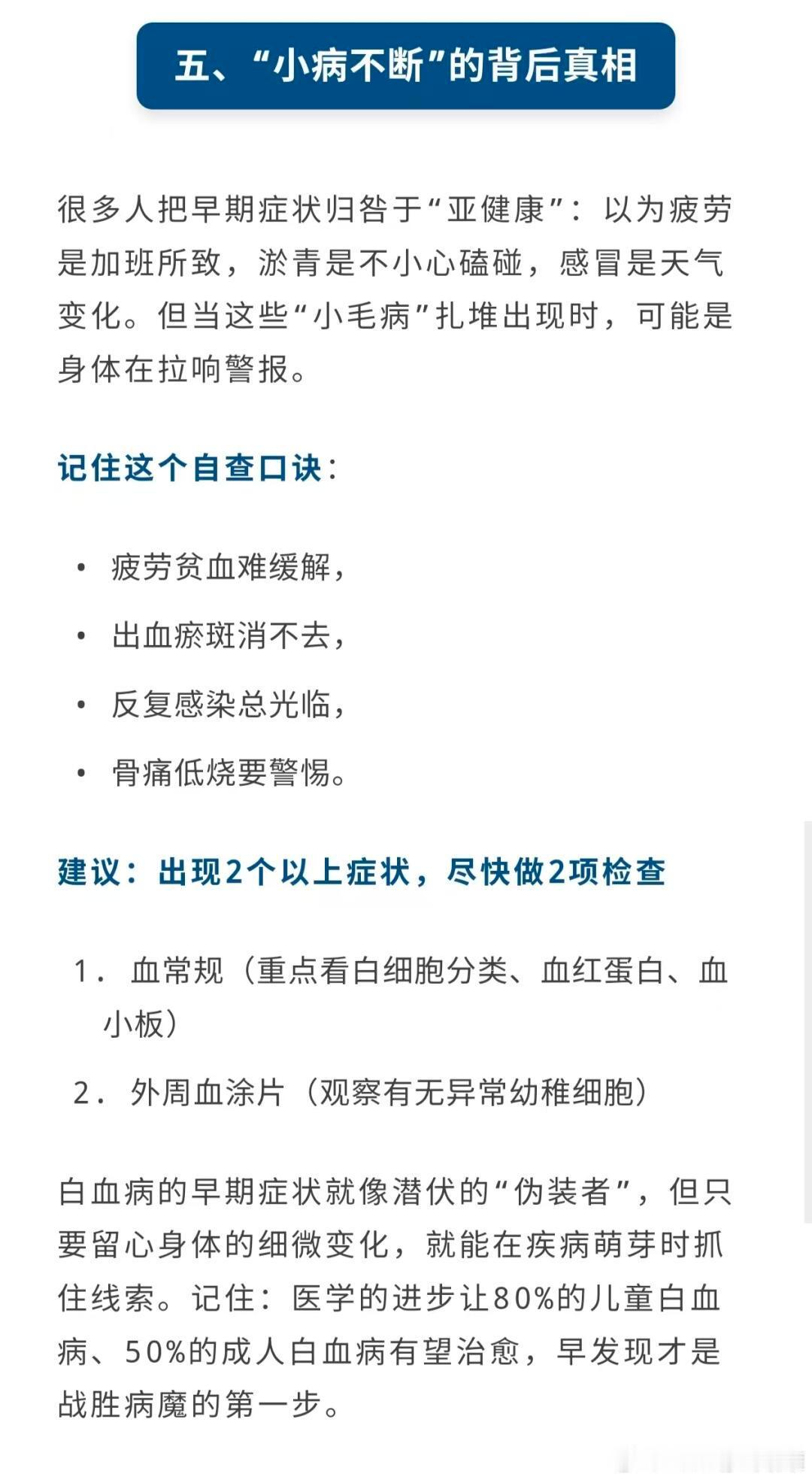 白血病的早期表现白血病早期的五个预警信号,白血病的早期症状就像潜伏的伪装者,但只要留心身体的细微变化就能在疾病萌芽时抓住线索。