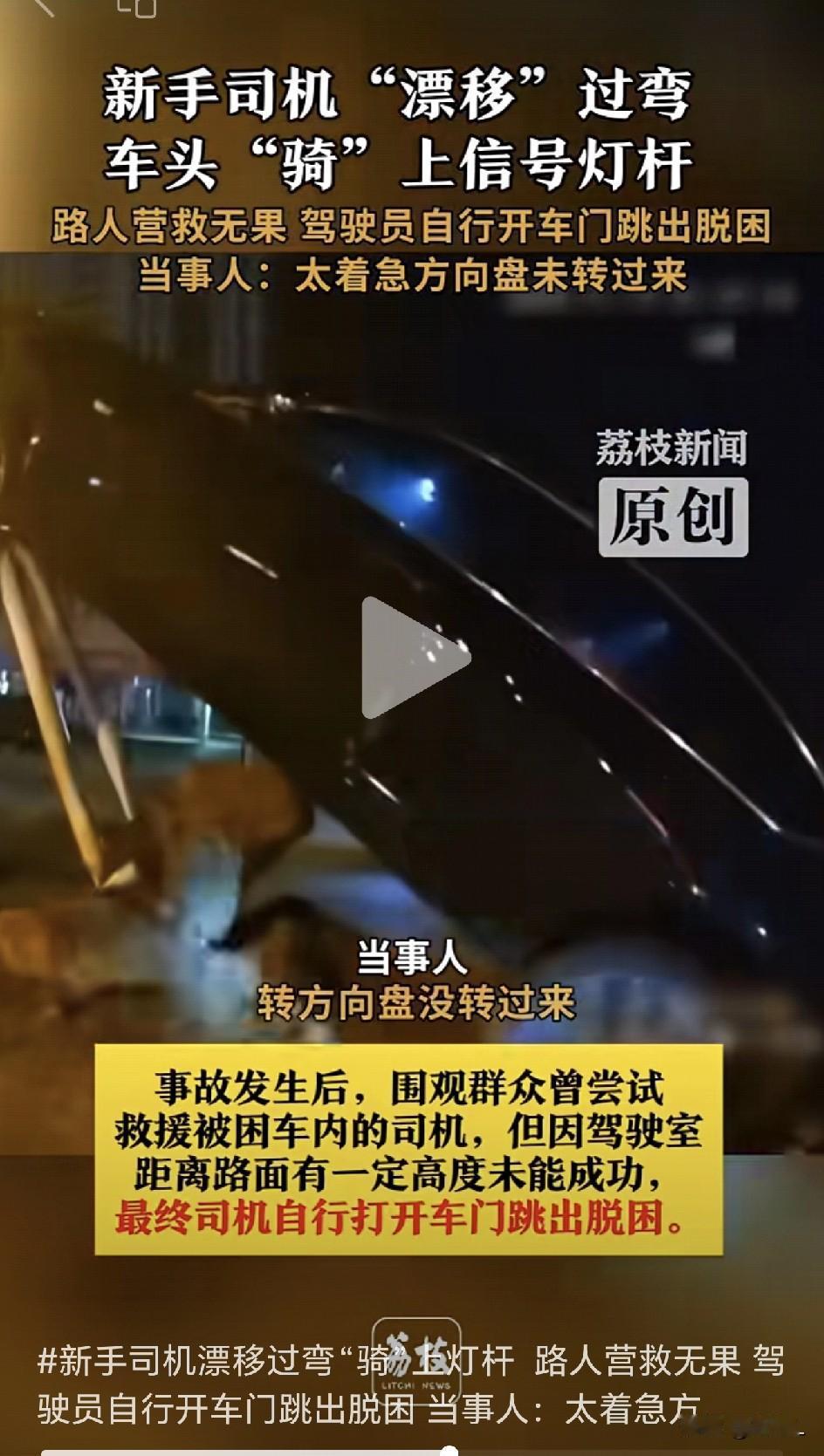 新手司机惊魂一刻!转弯失控“爬”上信号灯杆,车头翘起险象环生。 11月24日,江苏扬州街头,上演了惊险一幕。夜晚,一辆轿车在左转弯时突然失控,一个“漂移”冲上绿化带后,居然直接“骑”上了信号灯杆! 从视频中看出,整辆车呈45度角倾斜,车头高高翘起倚靠在灯杆上,车身严重变形,场面触目惊心。 事故发生后,现场路过的热心群众迅速上前试图救援,但因为驾驶室悬空过高插不上手,无法施救。 就在众人无计可施之际,驾驶员竟自行打开车门,从悬空的车内一跃而下,成功脱困,安然无恙。 经警方调查,驾驶员为一名刚拿驾照不到三个月的新手司机,排除酒驾嫌疑。目前事故原因正在进一步调查中。 网友们看了视频不由得为这位新手司机捏了一把冷汗: “这技术服了,没几个人能开成这样。” “特技啊!!” “技术、胆量、心理素质集一身才能开上去!” “信号灯:你没错,好,那我走!” “几十年老司机,也开不上去。” “转弯没减速而已。” “人没事就好。” “都说蚂蚁能上树,不曾想汽车也能上树了,这技术也服了,一直没看到刹车灯。” 这位小姐姐这车开的确实太危险了,网友也一句话点出了重点,转弯没有刹车,所以才会有漂移的险象,才会来不及打方向盘,控制不住车子的方向。 万幸,晚上车少人少。 万幸,那儿竖了一根信号灯杆。 万幸,车子撞上去的角度,刚好让车子滑动骑上了灯杆,而不是一头撞上去。 不然,这后果简直不敢多想、不敢深想,想想都后怕。 奉劝各位新手司机们,开车经验少,就千万别跟人比拼速度,慢一点没关系,安全最重要。 这一次幸运,下一次没人敢打包票! 信息来源于荔枝新闻,侵联删!
