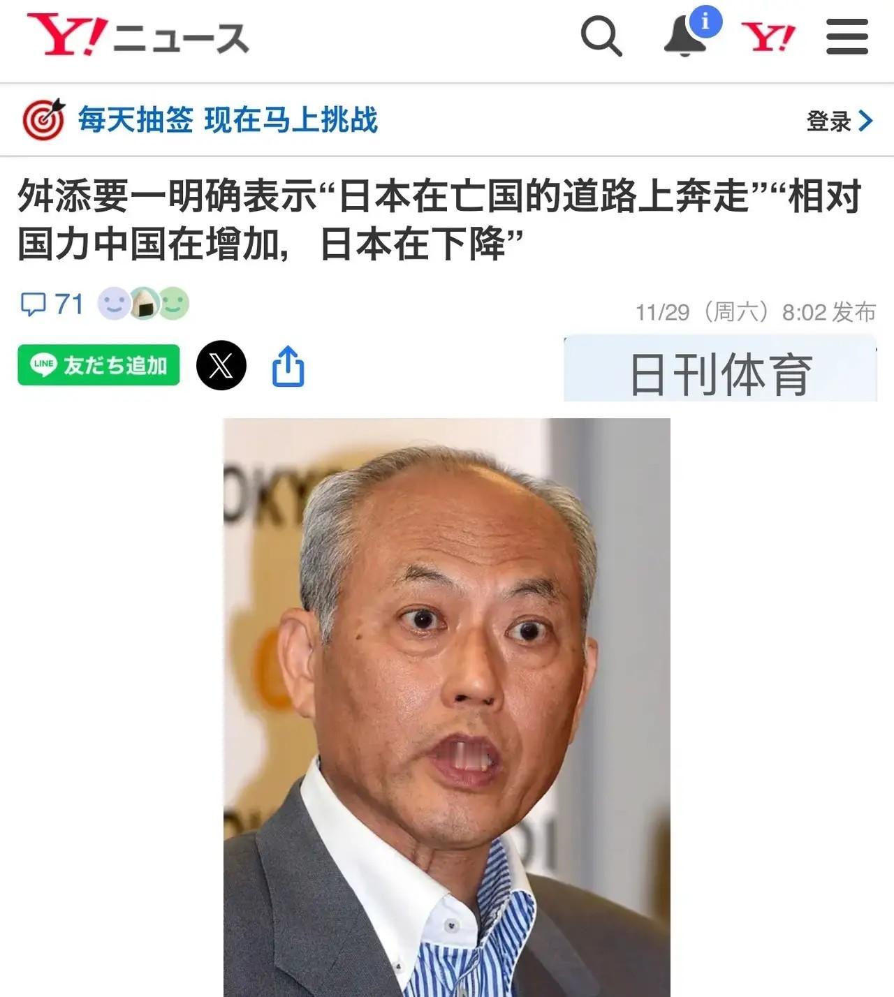 坐不住了!日本表态! 来自雅虎新闻网消息,日本前东京都知事舛添要一在29日针对紧张加剧的中日问题,向媒体提出了表态说“相对的国力,中国在增加,日本在下降,这是事实。连那个事实都承认不了的人,从15年前开始思考就停止了。日本媒体喜欢用那种右翼思想的评论员,结果一亿的国民低能化。日本正朝着亡国的路前进,大众媒体的责任很重。” 舛添要一这番话一出口就炸了锅,在日本国内引发了不小的争议,有人觉得他敢说大实话,戳中了日本当下的痛点,也有人骂他危言耸听,故意唱衰自己的国家。但平心而论,他说的国力变化确实是摆在明面上的事实,这些年中国不管是经济总量、科技发展还是国际影响力,都在稳步提升,反观日本,曾经靠着制造业风光无限,GDP长期稳居世界第二,如今却慢慢陷入了发展瓶颈,支柱产业竞争力下滑,经济增长乏力,就连普通民众的实际工资都出现了负增长,消费疲软的问题越来越突出。 最关键的是日本社会对这种现状的认知还严重脱节,很多人不愿意承认自身发展的滞后,反而被右翼思想带偏了节奏。这背后日本媒体要负很大责任,就像舛添要一吐槽的那样,不少日本媒体总爱找些持右翼观点的评论员发声,这些人刻意回避历史真相,还总渲染对立情绪,长期被这种言论包围,普通民众很难接触到客观真实的信息,思维慢慢固化,甚至形成了错误的认知。就拿历史教育来说,日本的教科书刻意淡化侵略史实,反而重点强调自己的受害经历,从小就让孩子形成片面的历史观,再加上媒体的推波助澜,整个社会的理性思考能力都在下降,这才是最危险的地方。 日本现在的困境,从来不是别人造成的,而是自身选择走偏了方向。数字经济时代到来的时候,日本在相关领域的投资和投入严重不足,没能及时完成产业升级,等中国、韩国在制造业和新兴产业上快速崛起,日本曾经的优势就慢慢消失了。可他们没有反思自己的战略失误,反而把问题归咎到年轻人不够努力、人口老龄化,甚至寄希望于美国击败其他国家来让自己受益,这种不靠自身自强、反而依赖别人的想法,根本解决不了任何问题,只会让发展之路越走越窄。 更让人担忧的是,右翼思想的蔓延还在影响日本的对外政策,在中日关系上频频制造摩擦,无视两国互利共赢的巨大空间。要知道中日一衣带水,不管是经贸往来还是民间交流都十分密切,良好的双边关系对两国民众都有好处。可有些日本政客被右翼思维裹挟,总在历史问题、领土问题上挑衅,媒体也跟着煽风点火,误导民众对中国的认知,这种做法不仅破坏了两国关系的基础,也让日本在国际社会上的形象受损,完全不符合日本的长远利益。 一个国家的衰落从来不是一蹴而就的,往往是从认知偏差、思想固化开始的。日本当下最该做的,是放下偏见,客观看待自身和他国的发展,摒弃右翼思维,让媒体传递真实客观的信息,引导民众理性思考,同时找准自身的发展定位,积极推动产业升级,改善与周边国家的关系,这样才能走出当前的困境。如果继续执迷不悟,只会在错误的道路上越走越远,最终吞下自己种下的苦果。 各位读者你们怎么看?欢迎在评论区讨论。日本对华态度 中日外交争议 中方对日本态度 日本评论中国 日本发展困境 问政日本 日本政治变局