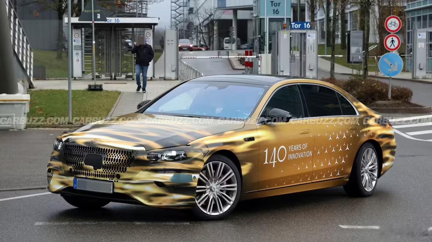 11 月 29 日消息,海外媒体于 11 月 28 日发布博文,曝光了一组奔驰新款 S 级轿车的路试实拍图。此次亮相的原型车专为品牌 140 周年纪念打造,车身覆盖着极具辨识度的金色火焰伪装膜,在路试中格外吸睛。2026 年对于奔驰而言是具有特殊意义的关键节点,品牌计划推出的这款新款 S 级轿车,不仅是常规的产品迭代升级,更承载着重要的纪念意义 —— 以此致敬卡尔・本茨为 “奔驰一号”(Patent Motorwagen)成功申请专利 140 周年这一汽车行业历史性时刻。奔驰