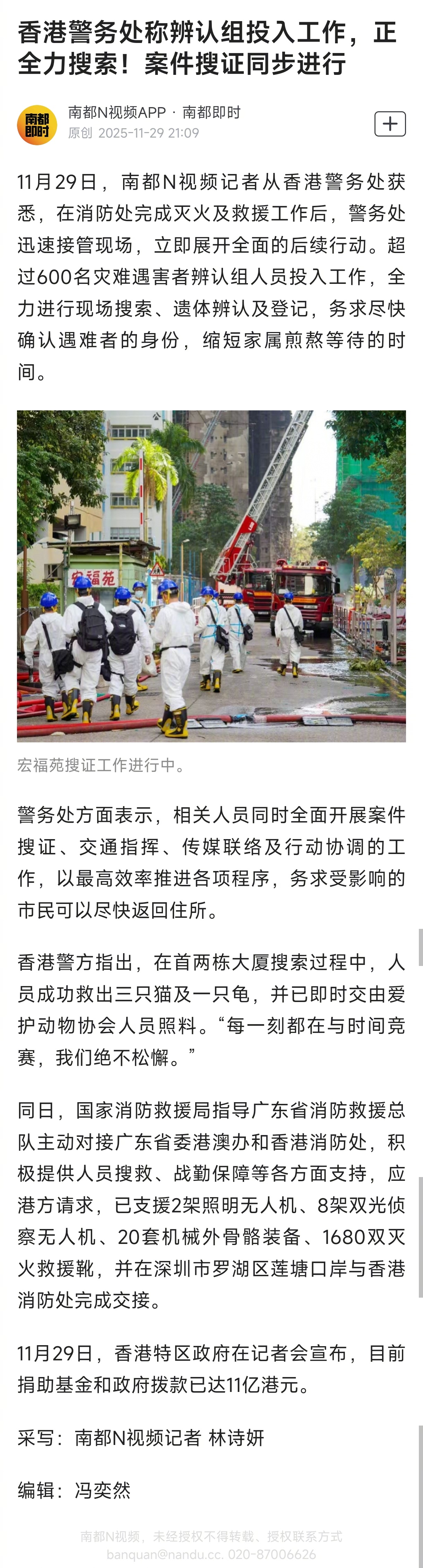 #香港警方称每一刻都在与时间竞赛#【#香港警务处称辨认组投入工作#,正全力搜索!案件搜证同步进行】11月29日,南都N视频记者从香港警务处获悉,在消防处完成灭火及救援工作后,警务处迅速接管现场,立即展开全面的后续行动。超过600名灾难遇害者辨认组人员投入工作,全力进行现场搜索、遗体辨认及登记,务求尽快确认遇难者的身份,缩短家属煎熬等待的时间。警务处方面表示,相关人员同时全面开展案件搜证、交通指挥、传媒联络及行动协调的工作,以最高效率推进各项程序,务求受影响的市民可以尽快返回住所。香港警方指出,在首两栋大厦搜索过程中,人员成功救出三只猫及一只龟,并已即时交由爱护动物协会人员照料。“每一刻都在与时间竞赛,我们绝不松懈。”