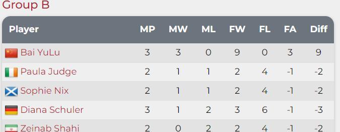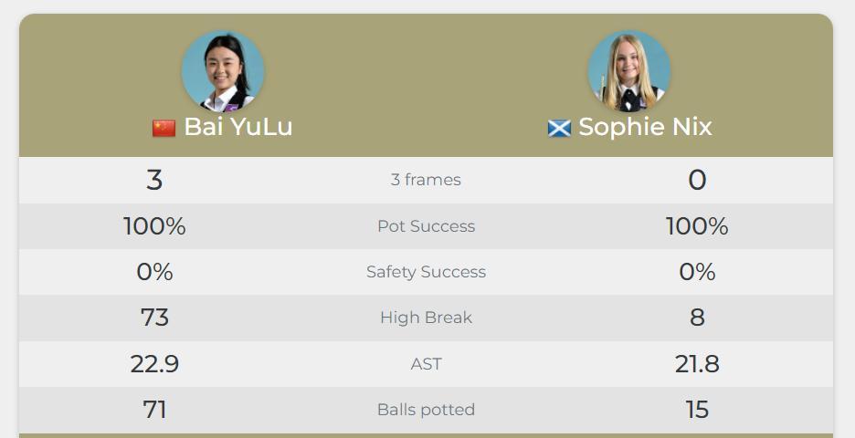 白雨露3-0索菲·尼克斯!2025爱尔兰女子斯诺克公开赛最新赛况! 赛会头号种子白雨露,打出单杆最高分71分,以3-0零封苏格兰八号种子尼克斯,目前为止,三战全胜,一局未失,列小组第一。 接下来,23:30,小组最后一场比赛,白雨露vs泽伊纳布·沙希(伊朗,12号种子)。 小组前两名晋级八强,白雨露基本上稳进八强了!确保600英镑的八强奖金。 明天进行淘汰赛,决出冠军,冠亚军奖金分别为6000、3000英镑。 #2025爱尔兰女子斯诺克公开赛# #白雨露#