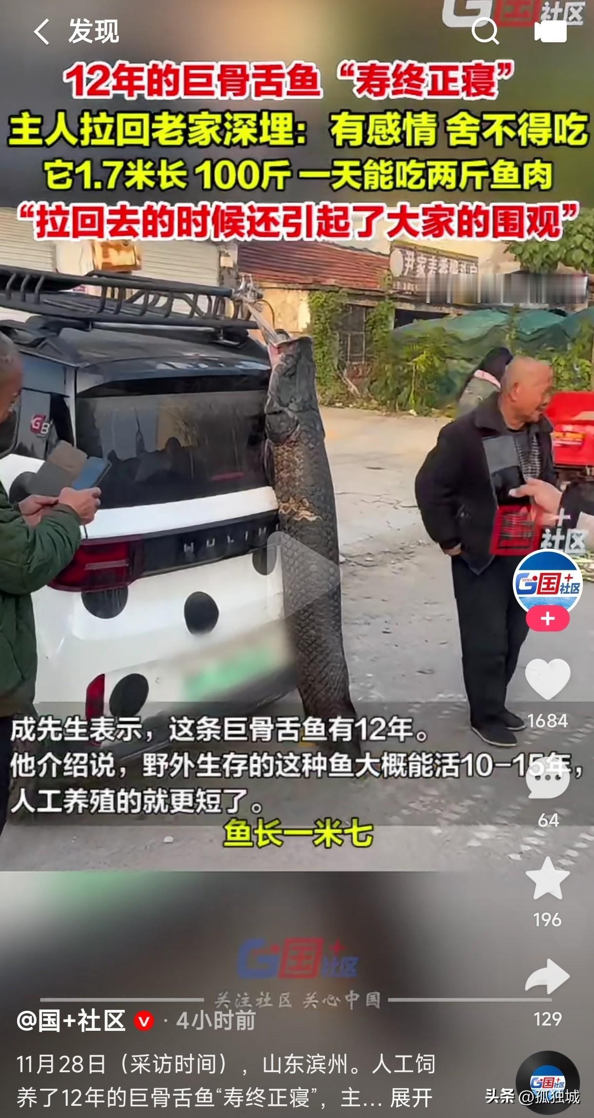 男子养了12年的巨骨舌鱼,长1.7米,重100斤寿终正寝,主人把他拉回老家深埋,要不仔细看还以为他把鱼埋在祖坟了? 养了12年也算是养出感情了,男子居然没有舍得吃他,直接把他拉回老家埋了,在拉回去的路上还引起了大家的围观,毕竟1.7米长的鱼对于普通人来说是很少见到的,拉这么长一条大鱼毕竟也是稀奇物,要是搁在谁家吃好几天估计都吃不完,主人和它具有深厚的感情了没舍得吃,直接拉回老家埋了。 起初我以为这男子把鱼埋在祖坟了,我也甚是觉得惊奇,评论区有网友也以为他埋在祖坟了,结果看完视频后他随便埋在了一块空地,瞬间也不那么惊讶了。 不管养的什么动物,时间久了毕竟也就有感情了,陪伴了十几年的鱼能忍心吃吗?