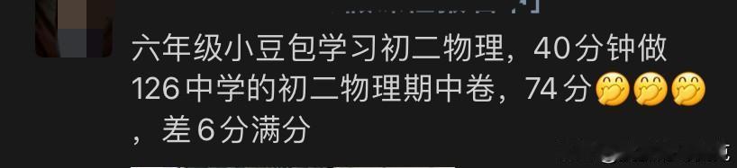 太他妈卷了,这是真的么? 六年级小豆包学习初二物理,40分钟做126中学的初二物理期中卷,74分[偷笑][偷笑][偷笑],差6分满分! 我问我女儿,是智商的问题还是你不够努力,她说滚蛋吧!