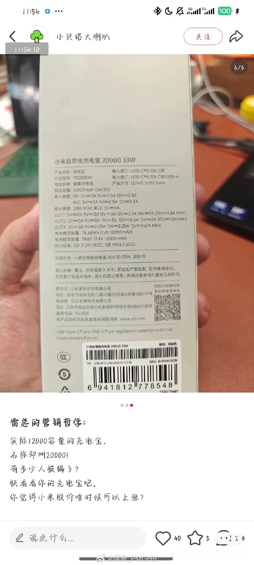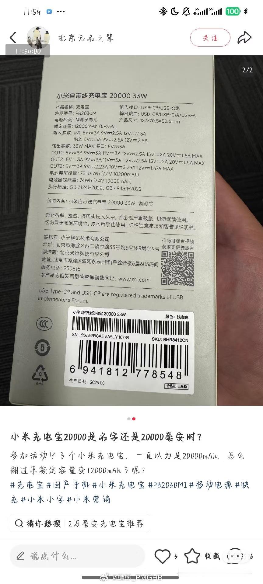 两条不同的小米充电宝负面,包装盒上的SN码是同一个,能看出来最近预算确实有向