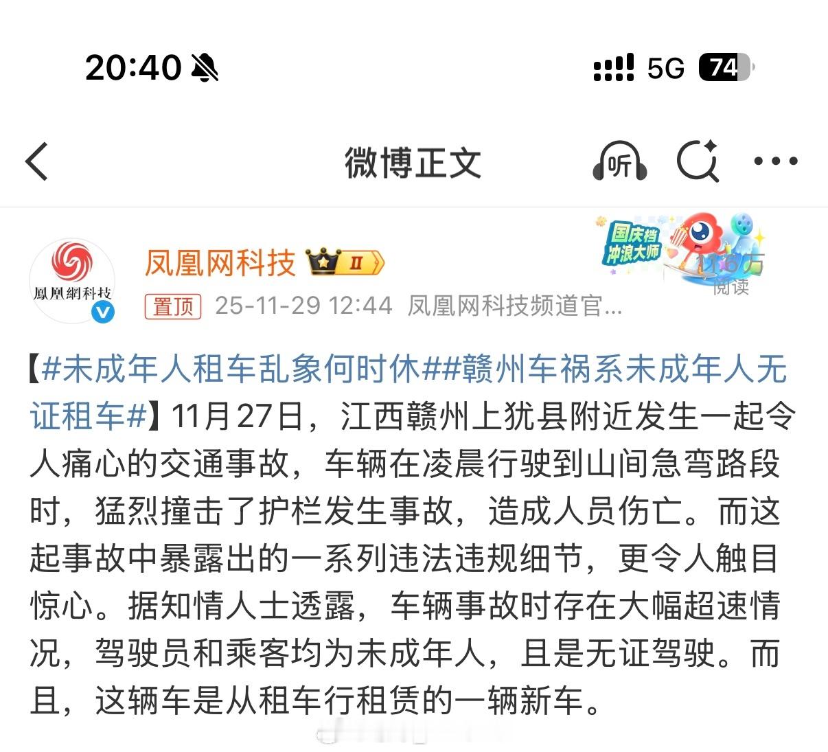 今天大家应该又看清了某些人的真面目吧,只是因为租车行乱租车给未成年人导致车祸,那群人就直接怪到小米身上,难道不应该是未成年人租车乱象何时休,这时候跟车有啥关系?回到事情本身,未成年、无证、超速、租车,这几个关键词组一块就很吓人了,所以还是建议各位吧精力放在这些方面赣州车祸系未成年人无证租车