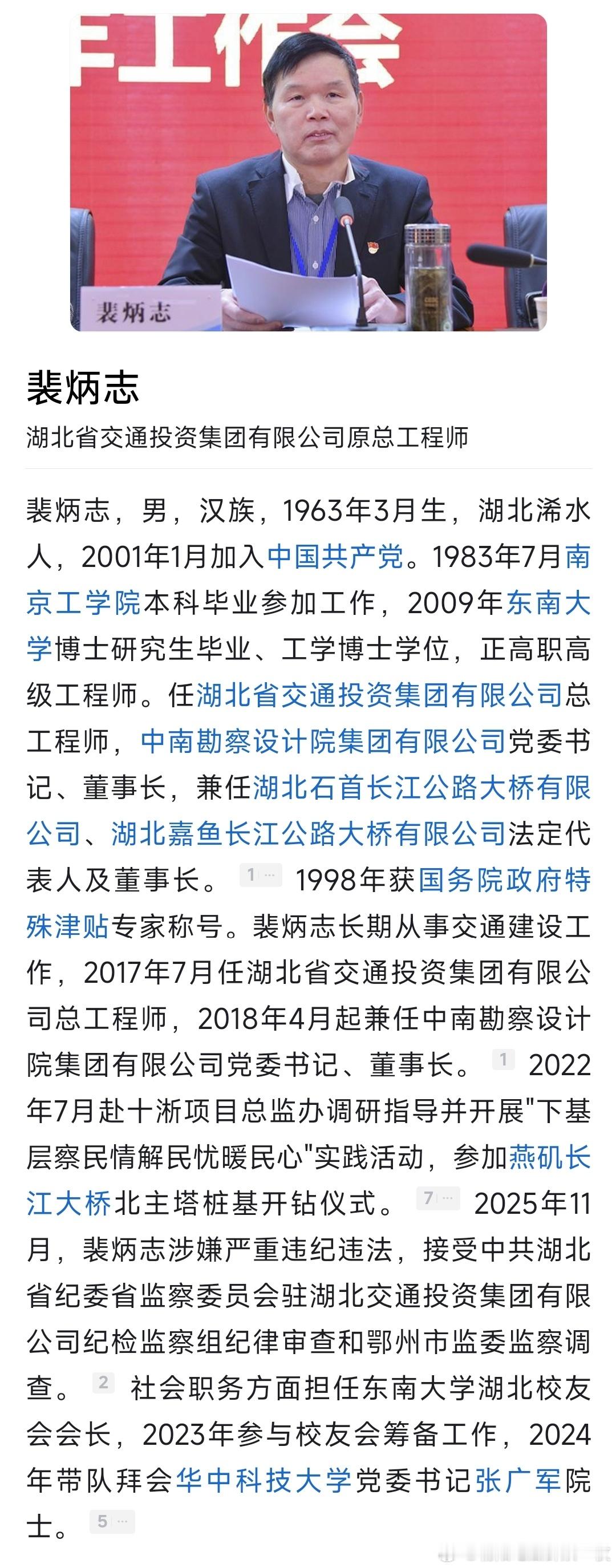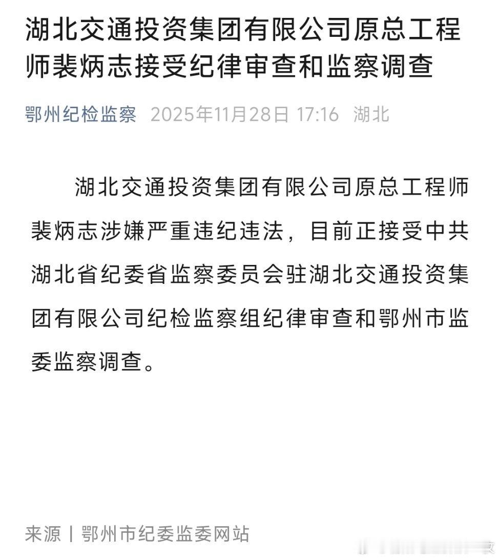 湖北交通投资集团有限公司原总工程师裴炳志接受纪律审查和监察调查!热点现场