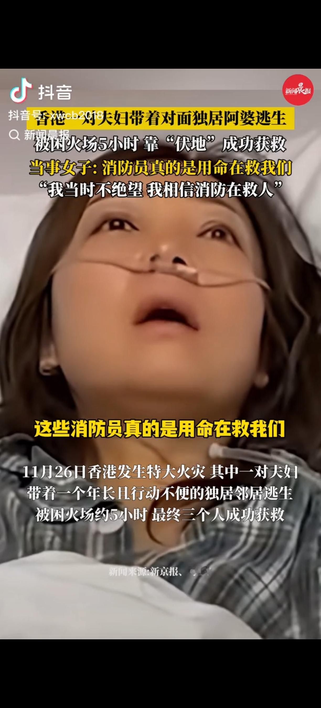 火灾中,香港一对夫妻一对夫妻冲进隔壁独居阿婆家,拉着她往外走。背后热浪滚滚,突然,女人一把把阿婆的头摁下,三个人伏在地上,躲在角落成功获救。 这对夫妻就住在独居阿婆的隔壁。11月26日香港那场特大火灾发生时,夫妻俩第一时间没顾着自己逃生,心里满是对隔壁行动不便阿婆的担忧。 他们快步冲进阿婆家,拉起还没完全反应过来的阿婆就往外走。可刚到楼道,火势就变得更凶猛了,热浪一阵阵地扑过来,呛人的浓烟也在往上涌。女子反应很快,一把摁下阿婆的头,三个人赶紧伏在地上,躲到了一个角落。 因为他们知道,烟是往上走的,伏在地上能少吸很多烟。就这样,他们在角落里被困了大概5个小时,最终成功被消防员救出。 事后,躺在病床上的女子感慨道:“这些消防员真的是用命在救我们。”她还说,自己当时一点都没绝望,因为她相信消防员肯定会来救人。 在撤离的时候,上面有很多火星喷下来,消防员还贴心地提醒她:“会烧到你的手,要小心。” 这事传开后,大家都夸这对夫妻善良又机智。有人说他们在那么危险的时候还想着帮邻居,是真正的好人;也有人说,多亏他们懂火灾逃生的知识,不然后果真的不堪设想。 夫妻俩说,当时也没多想,就觉得不能不管阿婆。那个摁头的动作,就是因为知道火灾里伏低身体更安全,所以赶紧让阿婆也伏下来。 他们的这份善举和机智,不光救了三个人的命,也给大家上了一堂特别生动的火灾逃生课。 各位读者你们怎么看?欢迎在评论区讨论。 来源:新闻晨报 2025-11-28发布
