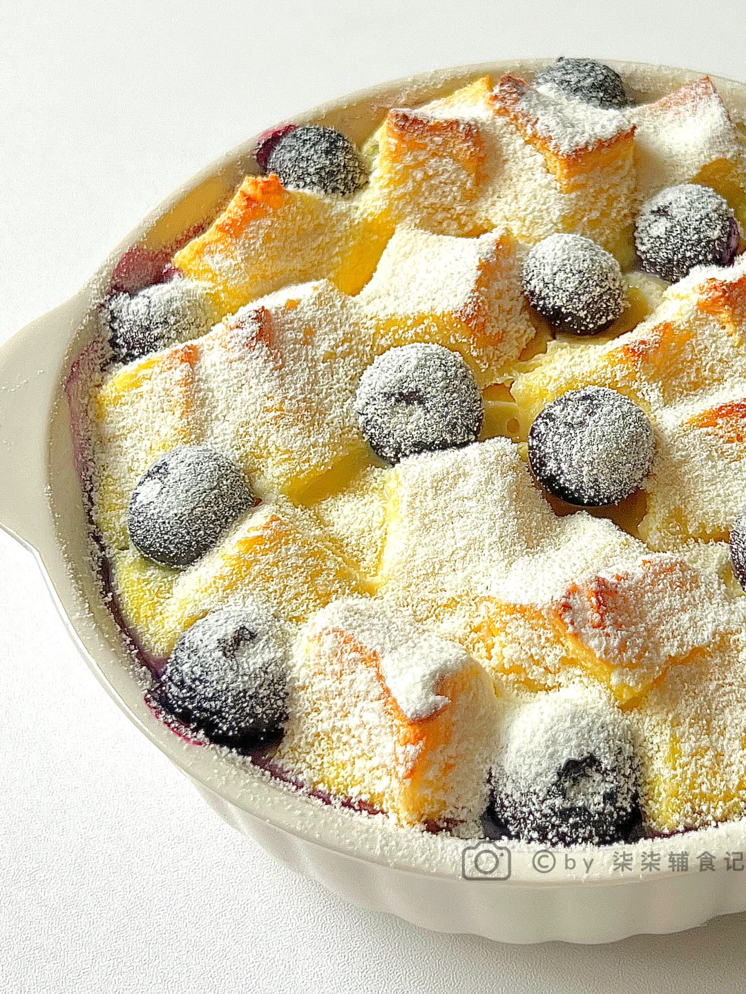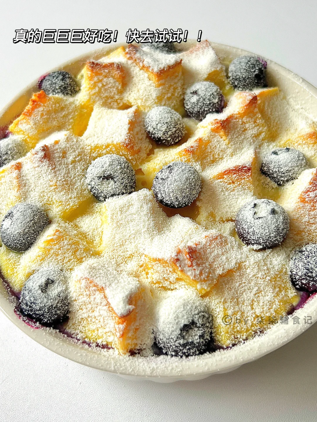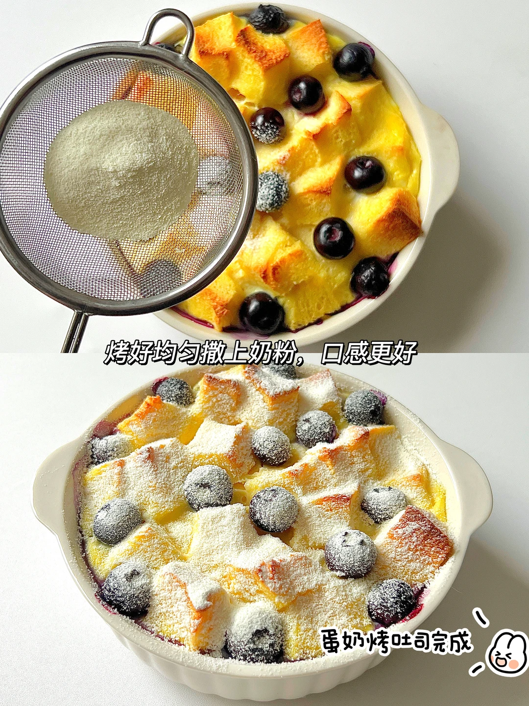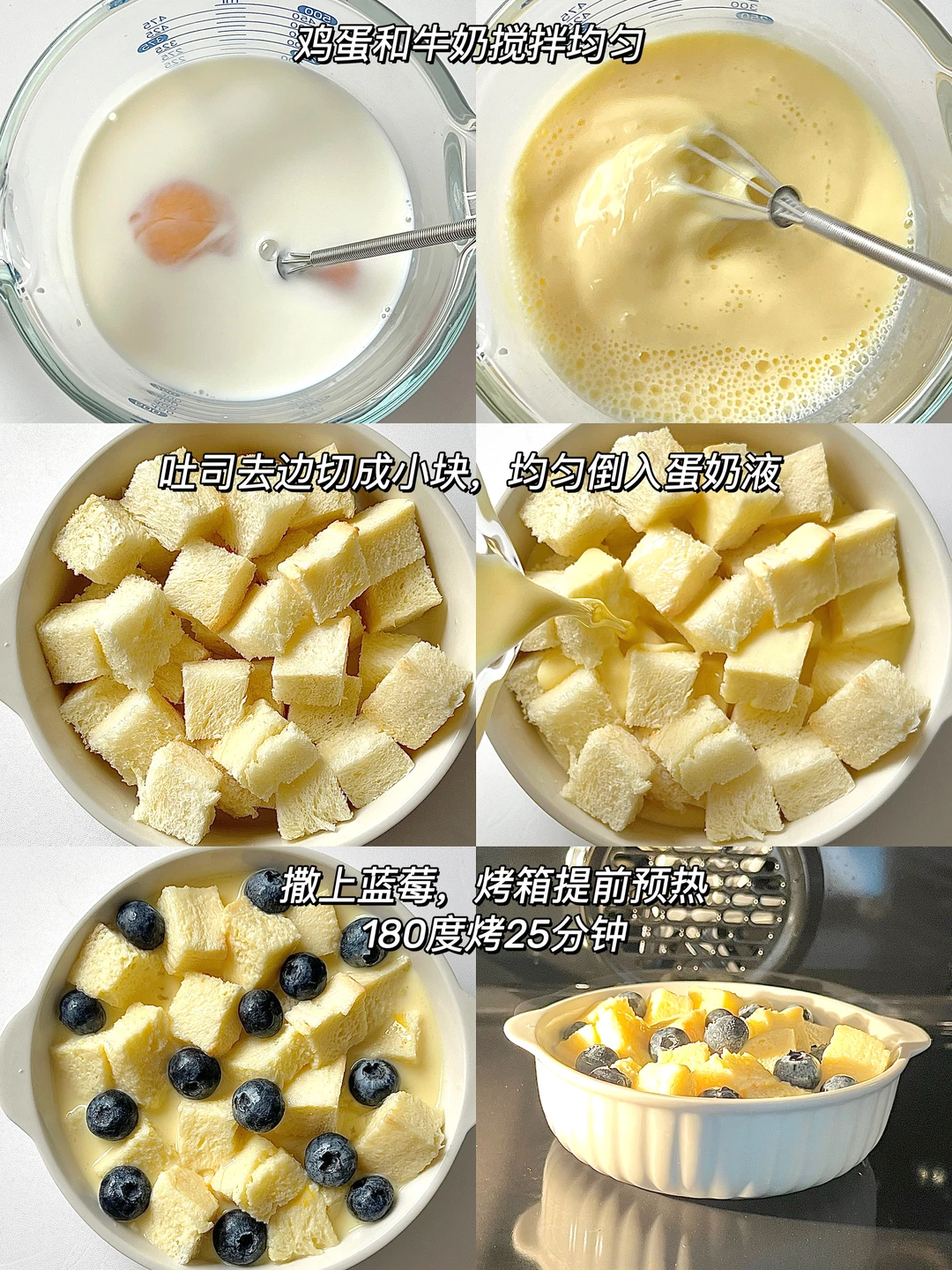 给柒柒做了好多次蛋奶烤吐司,真的松软香甜巨巨巨好吃!当早餐或下午茶真的是吃不腻,简单易做,几分钟就能完成,快去试试!! 🛒食材准备: - 吐司2片 - 鸡蛋2个 - 牛奶150ml - 蓝莓适量 🧑🍳制作过程: ▫️鸡蛋和奶搅拌均匀 ▫️吐司去边,切成小块 ▫️均匀倒入鸡蛋液,表面撒上蓝莓 ▫️烤箱提前预热180度烤25分钟 蓝莓蛋奶烤吐司就完成啦!真的松软香甜,真的不要太好吃!