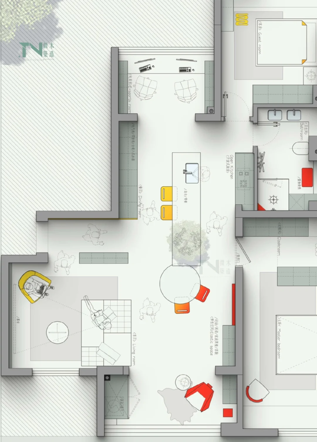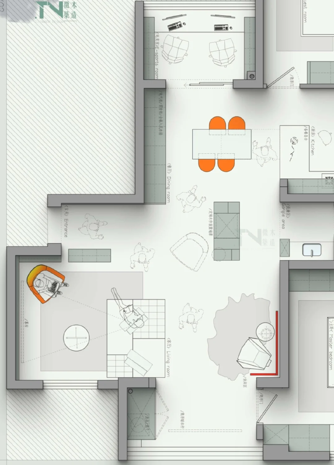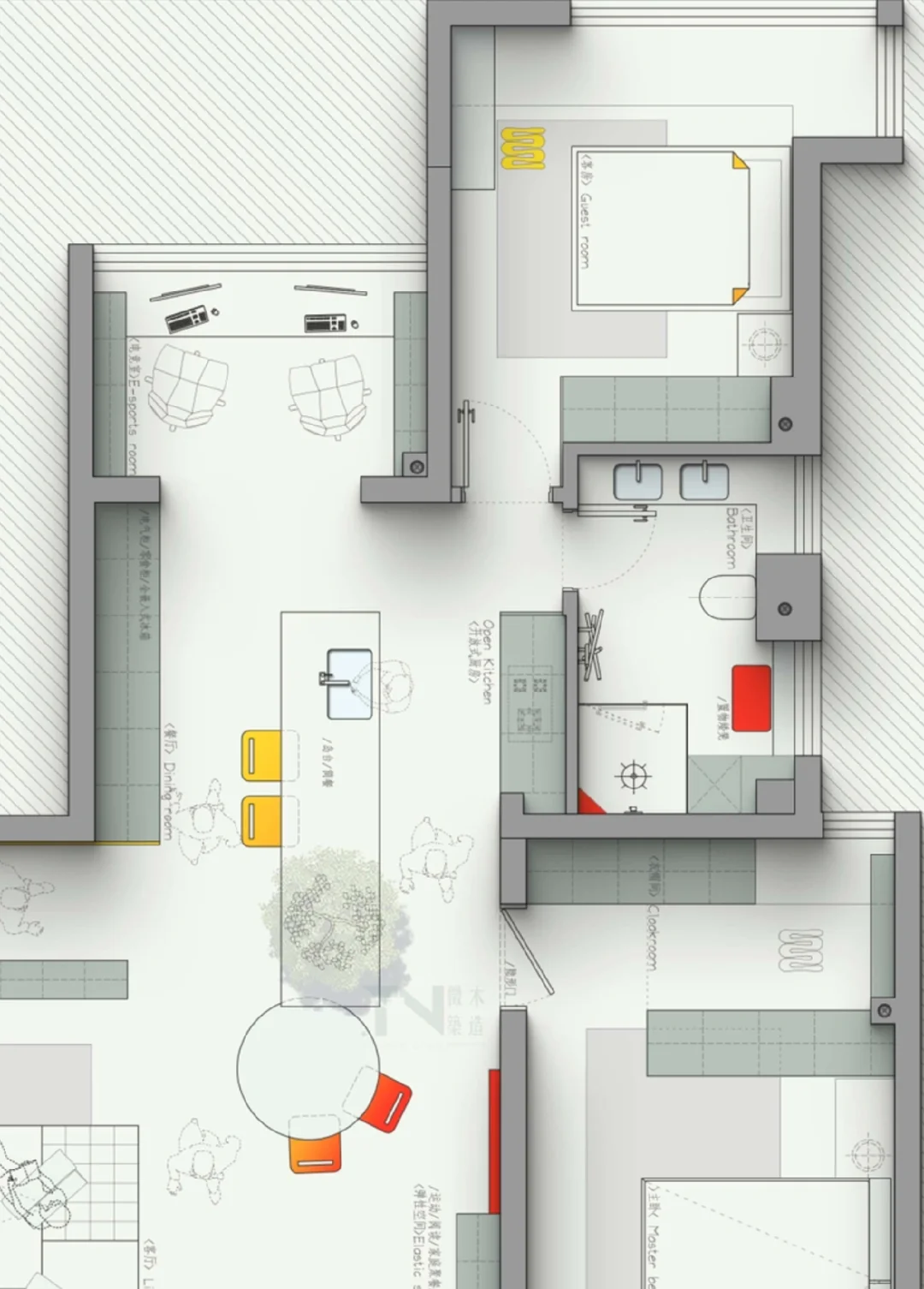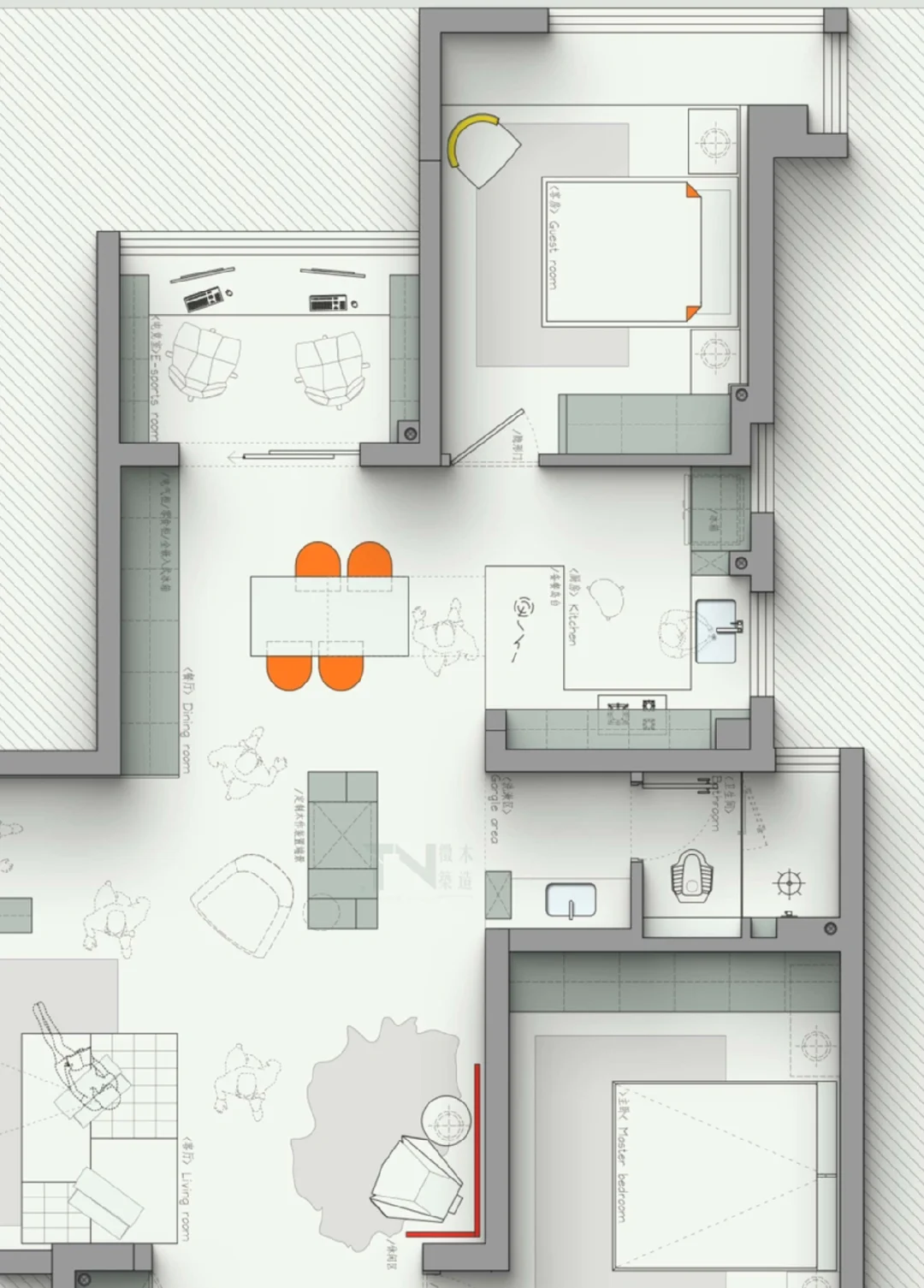 设计需求: 95后小情侣 1、喜欢打端游(需要电竞房) 2、一个主卧、一个客房 3、只需要一个卫生间 4、厨房想要开放式 5、避免改造后入户对卫生间门 6、房间的空调机可以拆除,阳台都可以封窗。