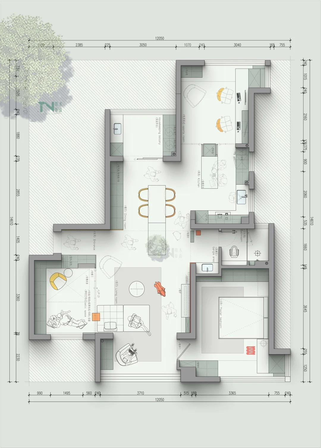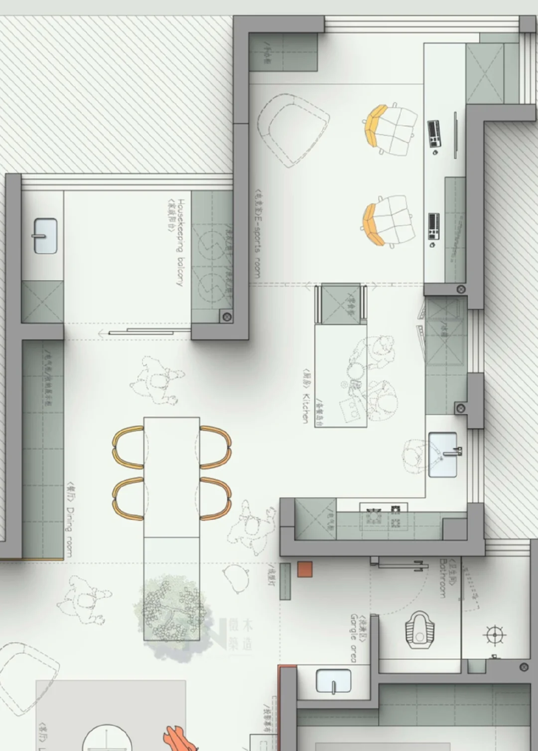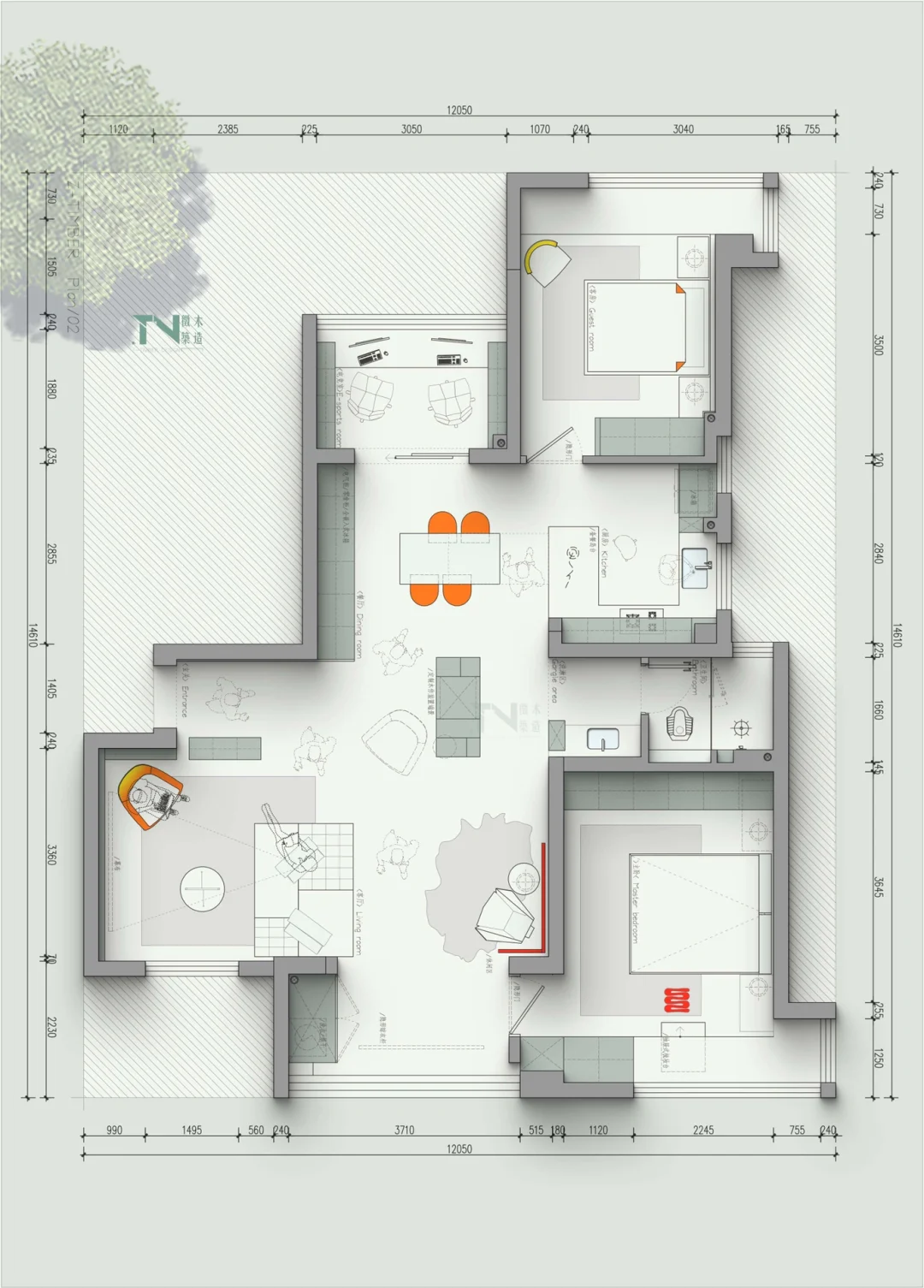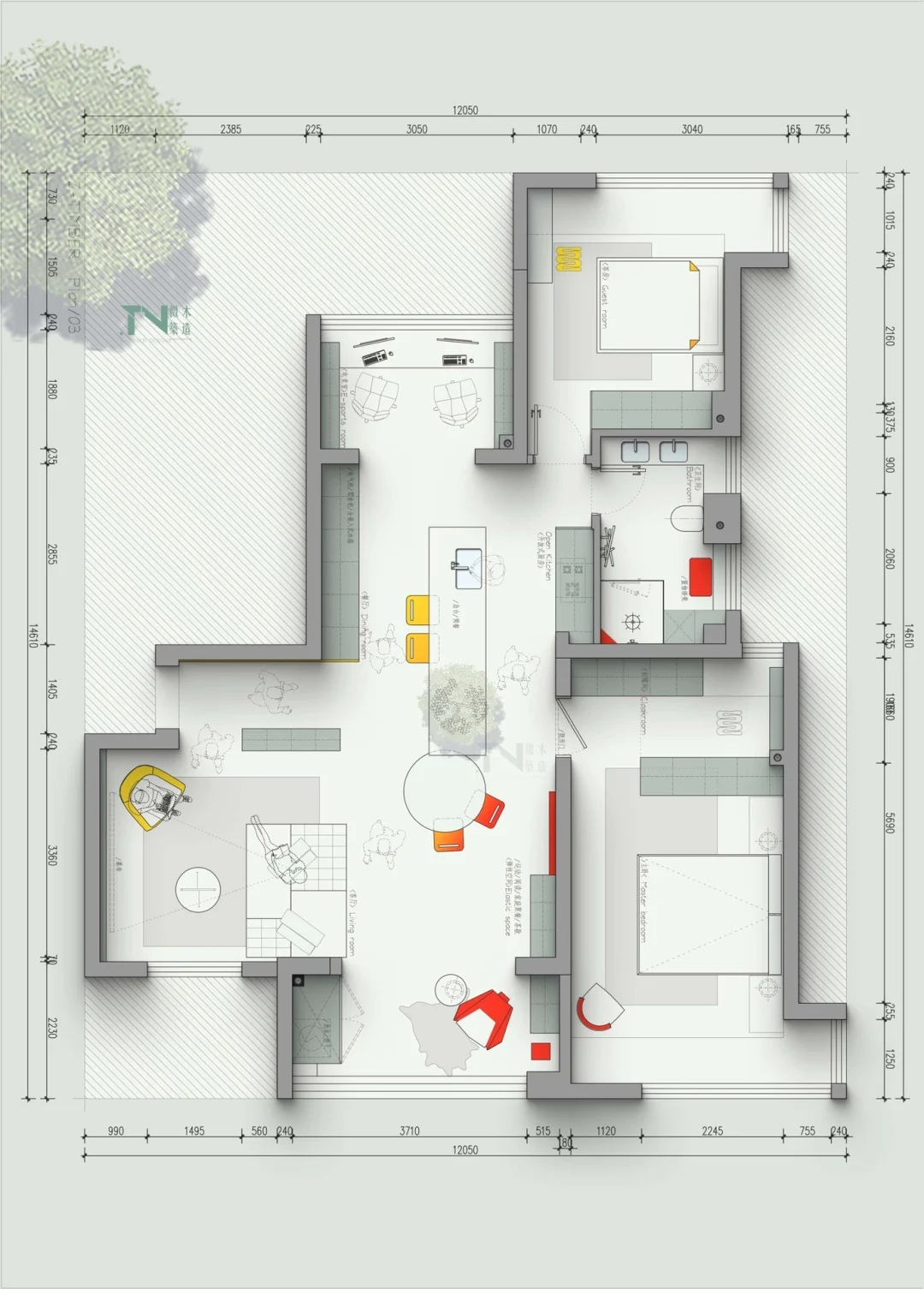 设计需求: 95后小情侣 1、喜欢打端游(需要电竞房) 2、一个主卧、一个客房 3、只需要一个卫生间 4、厨房想要开放式 5、避免改造后入户对卫生间门 6、房间的空调机可以拆除,阳台都可以封窗。