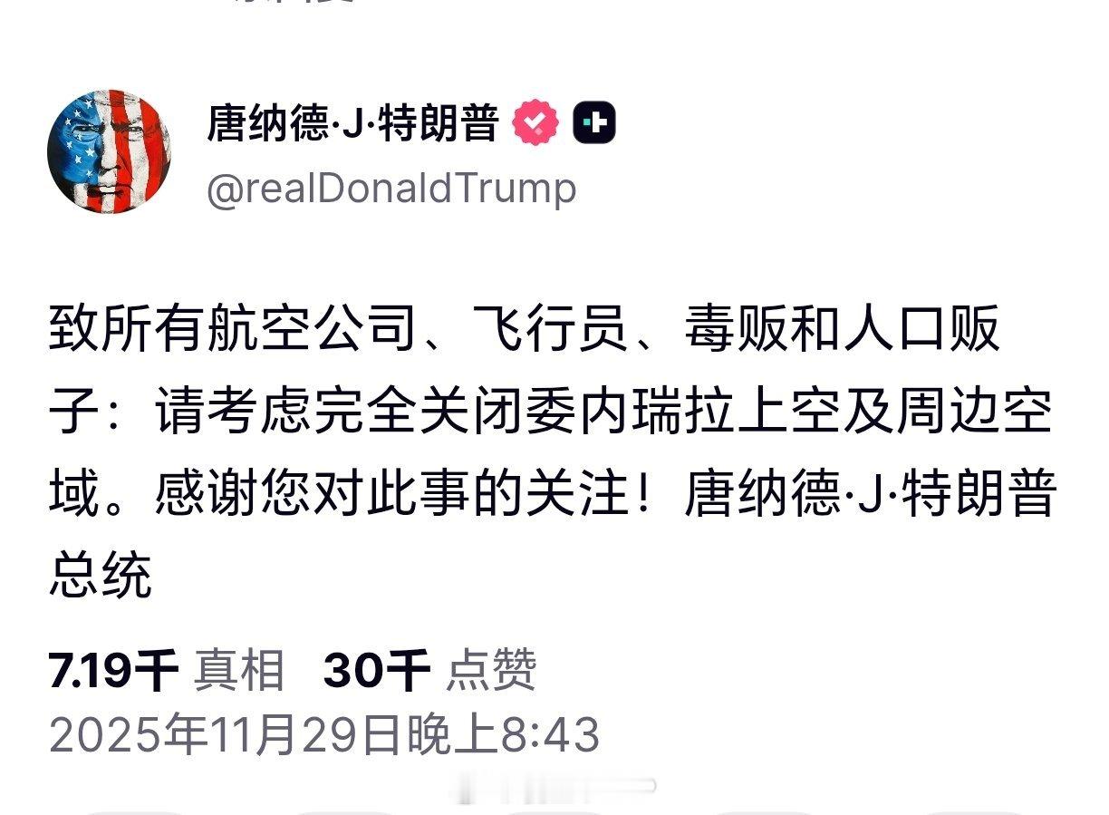 特朗普呼吁关闭委内瑞拉及周边领空特朗普呼吁所有航空公司将委内瑞拉上空及周边空域视为禁飞区:致所有航空公司、飞行员、毒贩和人口贩子:请考虑完全关闭委内瑞拉上空及周边空域。