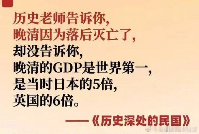 桂哥评:不能笼统的看GDP总量,还应当看GDP的科技含量,含金量。落后,科技上的落后,国防武器装备的落后,不能保护自己的财富。GDP再高,也很容易被列强抢劫。所谓,孩童重金过闹事,没有自我保护能力,你再富有,你也是被列强屠宰收割的对象。必须有拿捏对方,反制对方,甚至军备科技实力,有不被抢劫的手段和能力。这个至关重要。