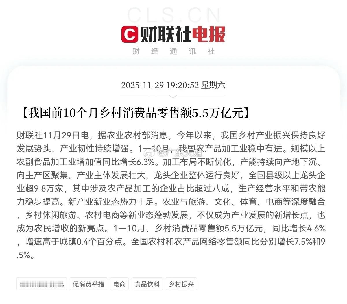 深夜大利好!乡村振兴来利好消息了!下周乡村振兴概念有望迎来大爆发,持有这个板块的此刻估计又要兴奋的睡不着了晚间10点30分,农业农村部最新消息,今年以来,我国乡村产业振兴保持良好发展势头,产业韧性持续增强,数据显示,我国前10个月乡村消费品零售额突破了5.5万亿,同比增长4.6%,这个消息对于乡村振兴是一大利好,这说明当前乡村人的收入是不错的,钱包鼓鼓的,看来乡村消费活力正在逐步增强,乡村消费市场正在持续复苏,这个消费能力可一点也不比城镇消费能力差啊,乡村地大物博本身具有庞大的消费市场,随着政策的发力,乡村消费有望在促进消费的行动中扮演着重要的角色,乡村振兴相关产业链公司将迎来最好的发展机遇,值得期待!股民们,坐稳扶好,受乡村消费数据持续向好的刺激,下周一乡村振兴概念有望起飞了,大消费要逐步稳起来了!