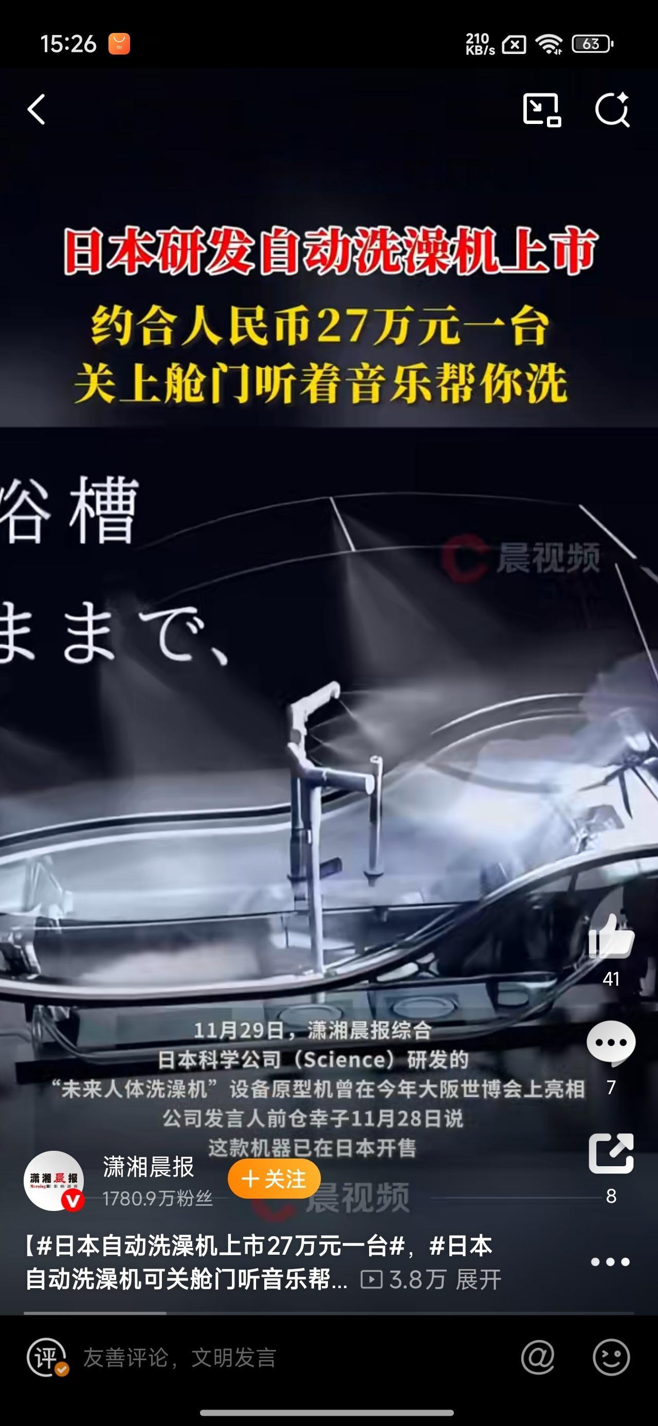 日本自动洗澡机上市271万元一台性价比几乎没有……