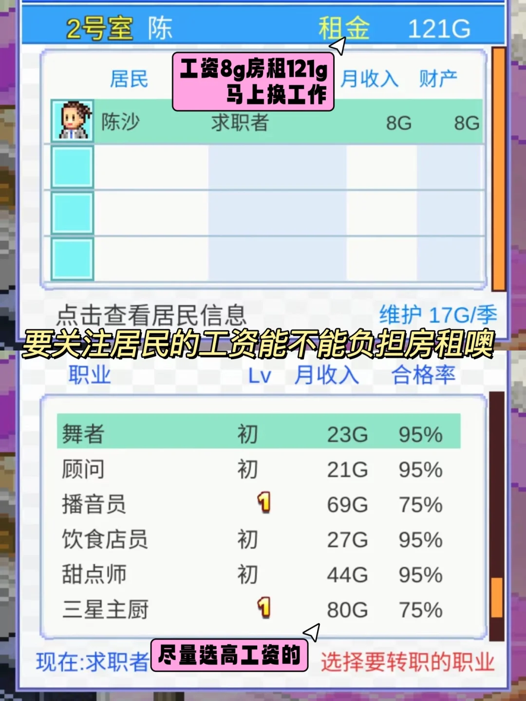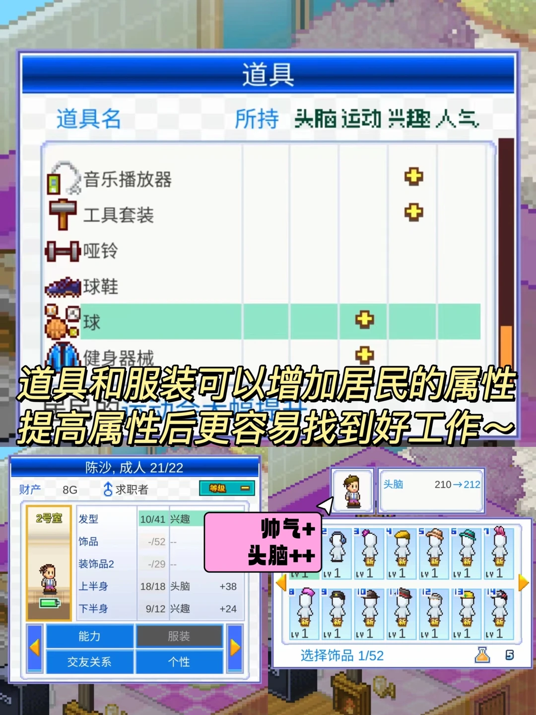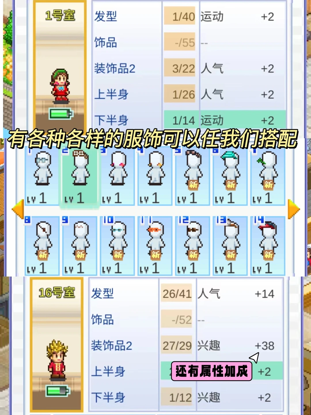 💖游戏里有很多服饰👗可以让我们搭配,我们可以选择把居民打扮的漂漂亮亮的,也可以帮他们打扮成搞怪可爱的。游戏里的服装、道具、还有特定的专用房间都是有属性加成的,这几样东西用的好,可以有事半功倍的作用,居民的属性提高了以后,我们就要为他选择工资更高的职业,这样他们才能交上更高的房租,形成一个良性循环[暗中观察R]。