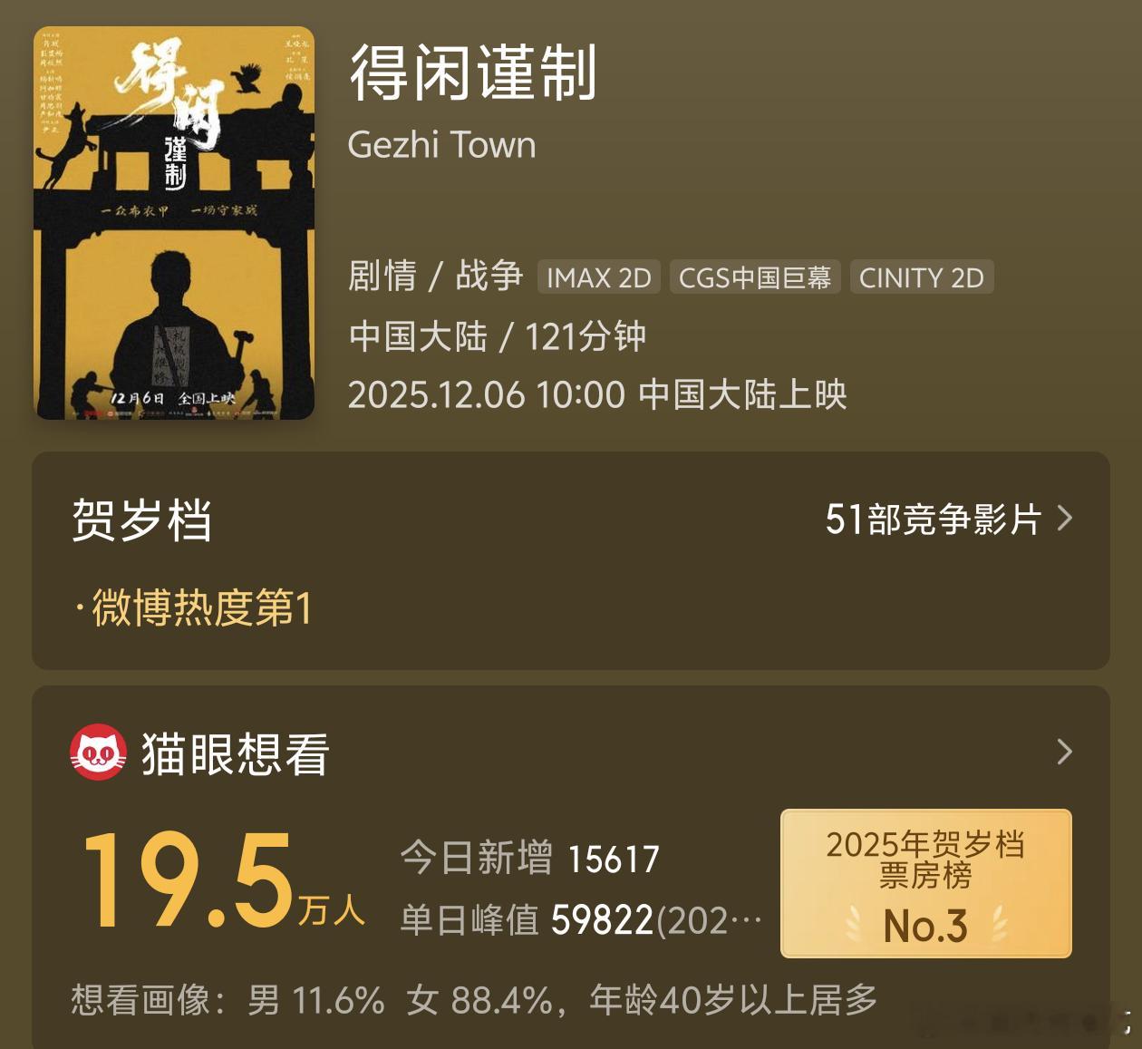 得闲谨制预售票房破3000万电影得闲谨制预售总票房破3000万,猫眼想看人数19.5万+,定档次日新增1.5万+ 得闲谨制把编剧排在主创第一位