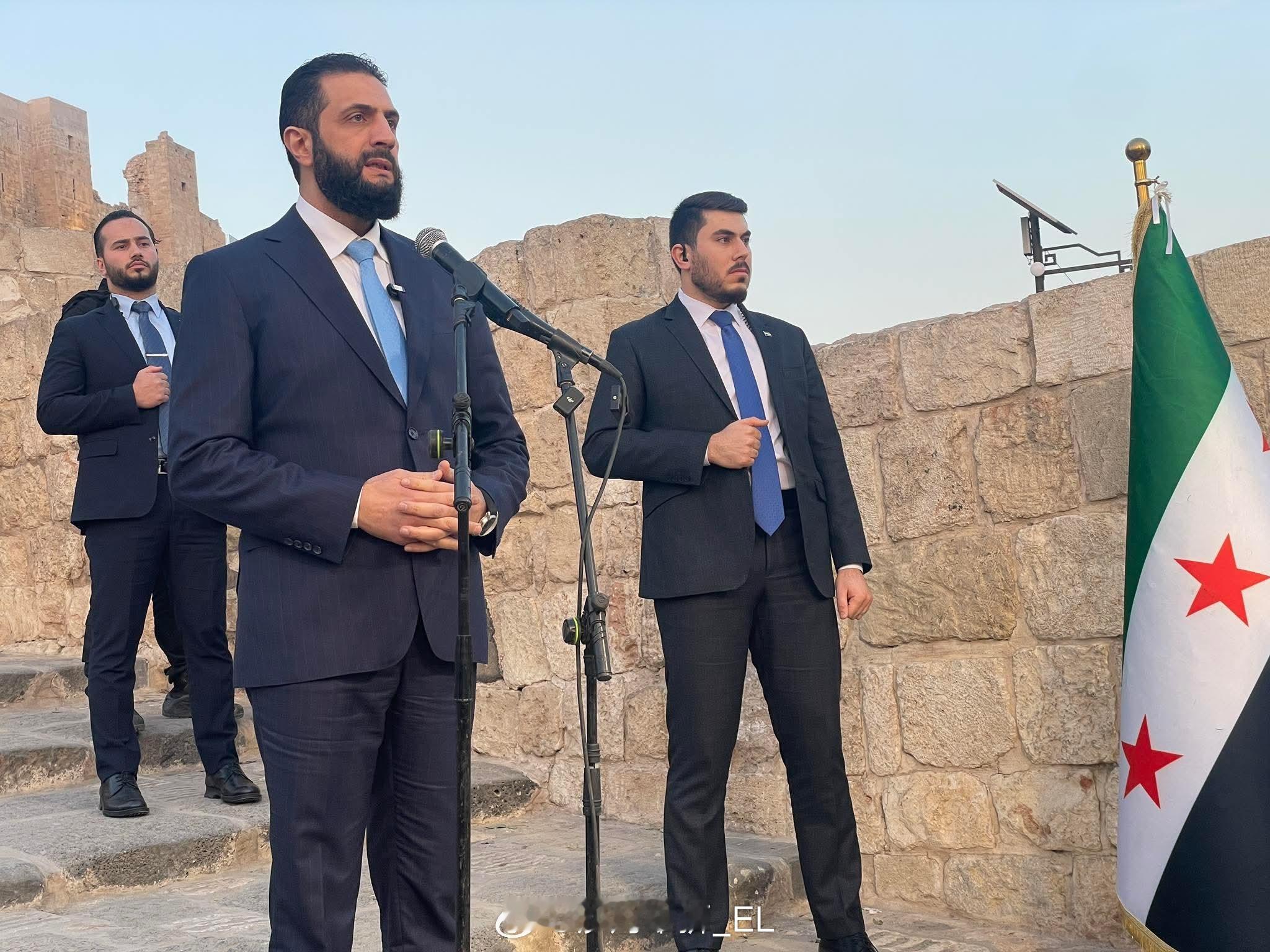 朱拉尼在阿勒颇城堡公开活动庆祝其夺取叙利亚政权一周年,旁边那个是他的保镖。相比于一年前,朱拉尼现在似乎变黑了一些,可能是因为户外活动增多了。