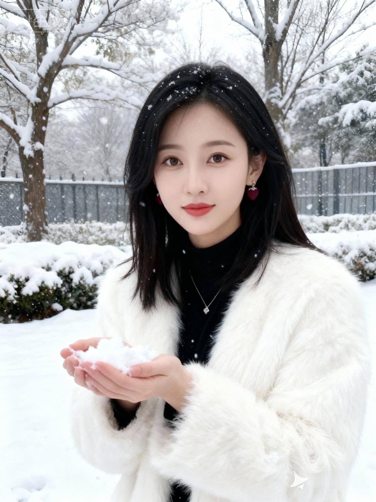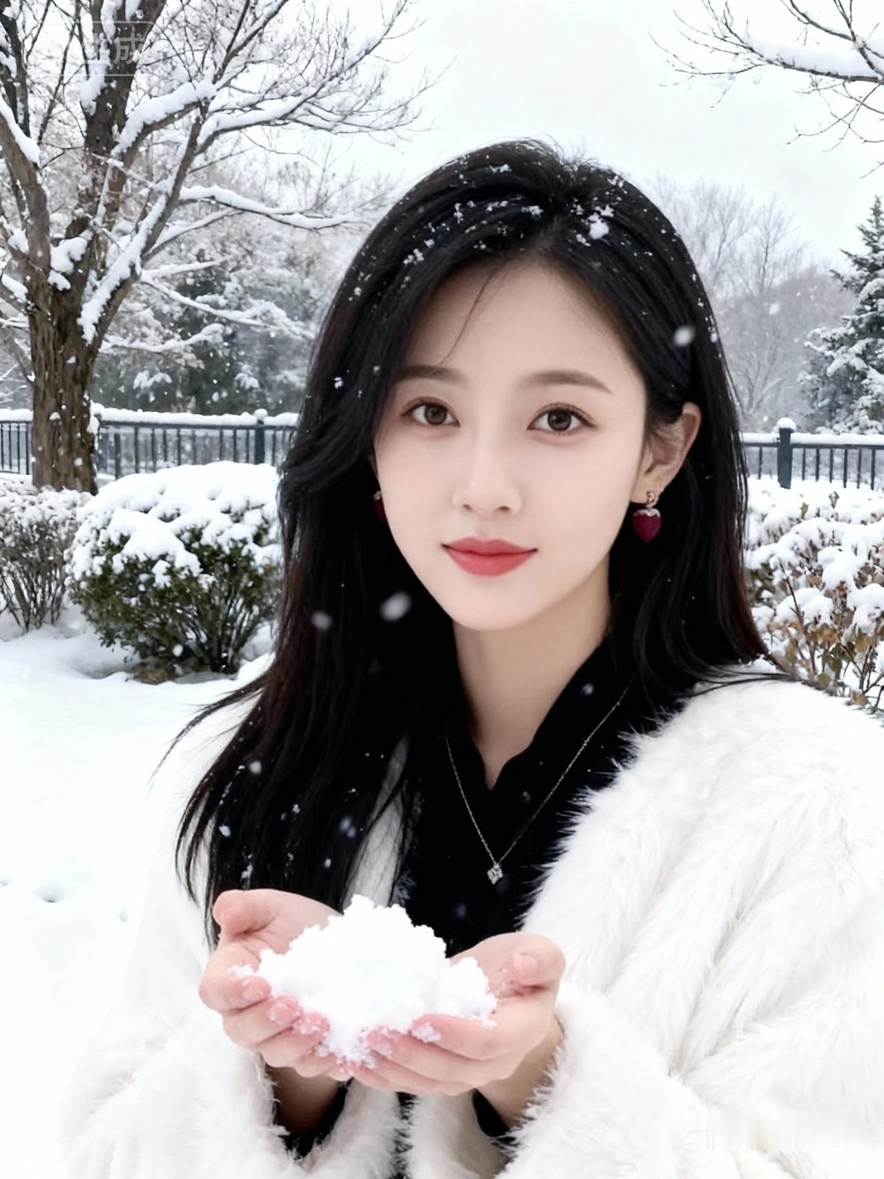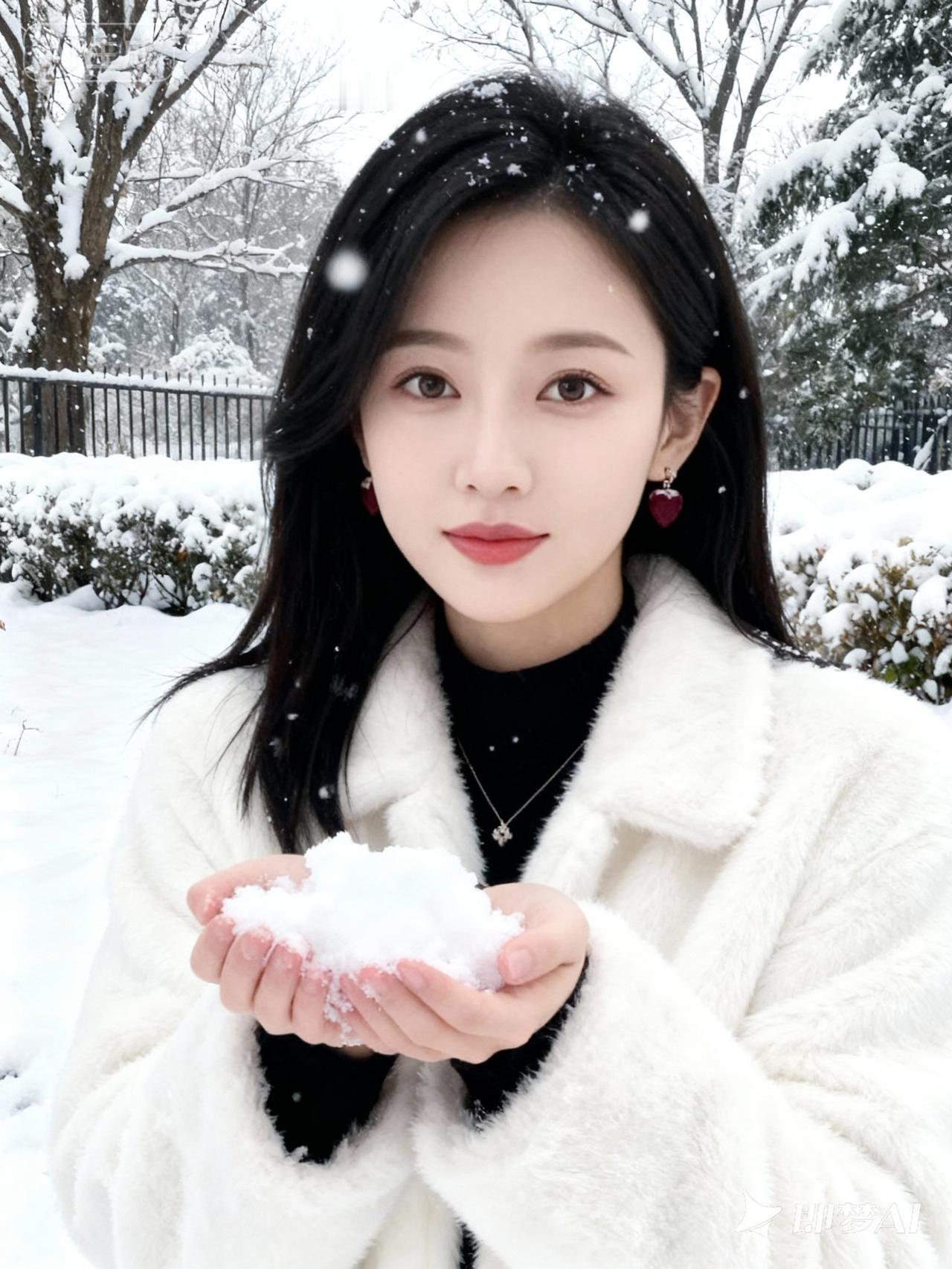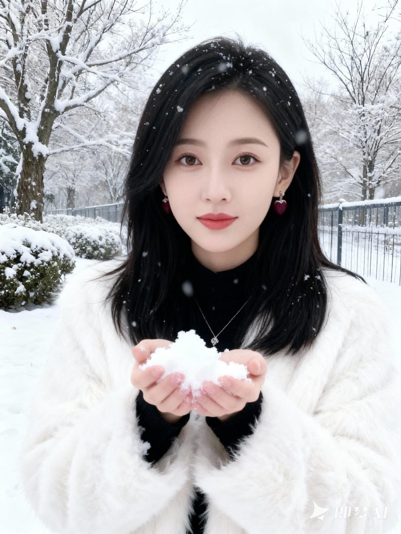 淡红唇亮眼,眼妆清透,长发乌黑披肩;绝世容颜。身着白色毛绒外套,内搭黑色衣物,颈间佩戴细链项链,耳饰精致;背景是白雪覆盖的树木、灌木丛与围栏,雪花纷飞,尽显冬日雪景;她双手捧起白雪,神态恬静自然,眼神清澈且略带温柔地看向镜头