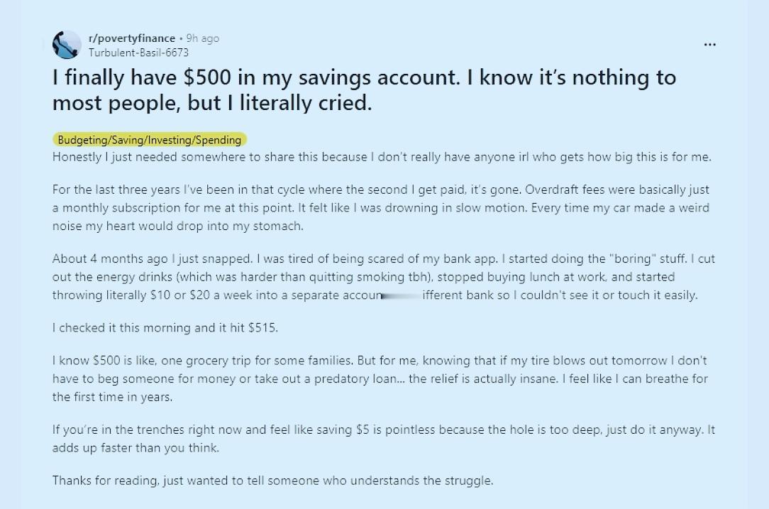 美国人消费观正在变化!越来越多的年轻人开始存钱!当前形势下相信很多人会产生共鸣! (一位美国月光族分享经历,为方便阅读以第一人称叙述) 我的储蓄账户里存到了500美元。很多人觉得不值一提,但我真的哭了,有懂得这种艰辛的人吗? 过去三年,我一直陷在这种循环里——工资到手就还帐单,消费,没过多久就清零。那种感觉就像在慢动作中溺水。 大约四个月前,我开始做那些“无聊”的正经事:戒掉能量饮料、自己带工作餐、每周固定往另一家银行的独立账户存10或20美元——这样既看不见也难动用。 500美元可能只够有些家庭超市的一次扫货。但对我来说,这意味着明天就算汽车爆胎也不必低声下气借钱或借高利贷…这种解脱感难以形容。多年来我第一次感觉能自由呼吸了。 如果你正处于困境,觉得攒100元无济于事,因为债务深不见底,但无论如何请坚持存下去。积少成多的速度比你想象的更快。 是啊,现在起普通人应努力储蓄、不要负债、别碰网贷、适度锻炼、保持健康。