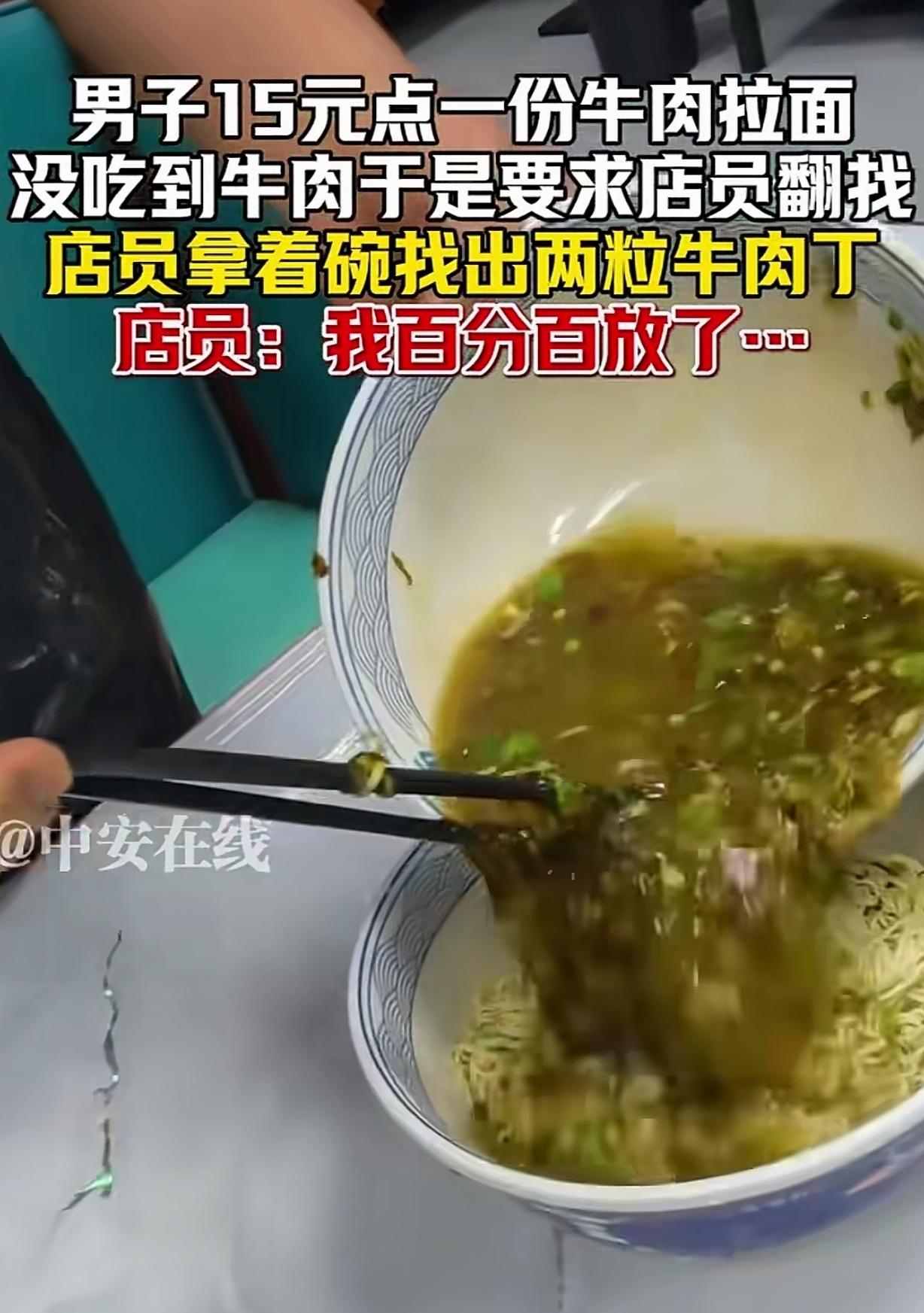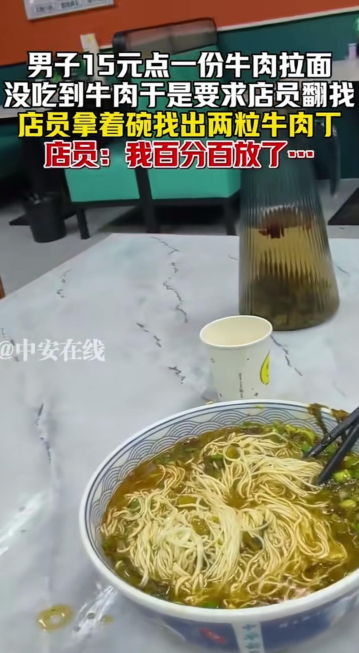 “这店不倒真没天理!”新疆,一男子花15元点了一碗牛肉面,可把面翻了个底朝天,竟然一片肉都没有,可把男子气坏了,这叫啥牛肉面?男子愤怒的要求店员给自己一个解释?店员说他百分百放牛肉了,男子让店员找出来牛肉,店员拿来一个碗,直接把牛肉面倒了进去,从碗底翻出2个东西,男子一看瞬间傻眼。网友:一牛传三代,人走牛还在。 11月28日这天,一男子觉得肚子饿,就来到某家牛肉拉面馆,点了一碗酸菜牛肉拉面。 很快,一碗热气腾腾,现吃现拉的酸菜牛肉拉面端了上来,香味扑鼻,让人食欲大开。 男子拿起筷子,伸进碗里开始搅动拉面,想让酸菜,汤汁,还有面条充分融合在一起,然后吃起来才有滋有味。 可搅完面,男子生气了,他只看到碗里有酸菜,有面条,有汤水,但一片牛肉也没看见。 男子以为自己没找到牛肉,不代表没有,否则就叫“酸菜拉面”,而不是“酸菜牛肉拉面”了,可能被面条盖住,自己没发现。 于是,男子又搅动了几下,彻底不淡定了,他把拉面翻了个底朝天,还真是一片牛肉都没有。 可把男子气的不轻,这不是货不对板吗?这不是欺骗消费者者吗?这不是把顾客当傻子吗? 按理说,一碗牛肉拉面也就10-12元,可这家店要价15元,已经很贵了,可打着酸菜牛肉拉面的幌子,却一片牛肉都没有,这让人愤愤不平。 既然没牛肉,只有酸菜,那就实事求是,叫“酸菜拉面”好了呀,叫牛肉拉面却没牛肉,这就叫虚假宣传,货不真价不实。 男子觉得自己被捉弄了,较起真来,他叫来店员,气哼哼的问他,牛肉拉面里为啥没牛肉?哪怕有一片,他都不至于这么生气! 可店员理直气壮的说,他百分百放牛肉了,怎么可能没有? 男子听了更是气不打一处来,店员那意思,难道自己睁眼说瞎话?还是他放牛肉,被自己吃了,然后故意找茬? 男子跟店员杠上了,要求自己手里录像,让他把牛肉给自己找出来,店员回头就去后厨拿了一个碗,直接端起牛肉面,用筷子把面挑起来,放在空碗里,然后又把碗底的酸菜汤汁倒进另一个碗里。 这时,让男子目瞪口呆的一幕发生了,店员用筷子从碗里扒拉出2粒牛肉粒,放在了空碗里。 大家没看错,确实是2粒牛肉粒,多一粒都没有,不仔细看,都没看出来是牛肉,小的都没指甲盖大。 店员找出来后,以胜利者的姿态看着男子,男子哭笑不得。 都说做牛肉面生意的,是一牛传三代,人走牛还在。这回男子可真信了。 男子气炸了,至于这么玩套路吗?如果嫌卖的便宜,就加点价多放点肉,如果价格没问题,这不是欺骗嘛?为了15元钱,商家真是煞费苦心。何苦因小失了大义。 天天有人喊着实体店不好干,天天赔钱倒闭,实际是自己把自己干倒闭了,你想一本万利发财,那就马上倒闭。 兰州拉面,半小碗稀碎肉做一天生意,十五元和二十元的一样的面,二十元汤多点碗大点。我因为好奇吃过两碗。从此再也不在外面吃牛肉面,因为受不了那塞牙缝的肉欺骗我的胃。 这事儿真是让人又好气又好笑!15块钱一碗的“酸菜牛肉拉面”,翻遍碗底就扒拉出两粒指甲盖大的牛肉粒,这哪是牛肉面,简直是“牛肉粒面”啊!商家这操作,说是“一牛传三代”都算抬举了,怕不是一头牛能供全城面馆用一年! 咱们消费者花钱买的是啥?是信任!你菜单上明明白白写着“牛肉拉面”,结果端上来连片肉星都看不见,这不是挂羊头卖狗肉吗? 更气人的是店员那态度,理直气壮说“百分百放了”,结果找出来两粒肉,这不是打自己脸吗? 现在实体店难做,可难做的原因是啥?不就是有些商家总想着玩套路、坑顾客吗?一碗面多放两片肉能亏本?非要把“诚信”二字扔地上踩,最后只能把顾客越推越远。 就像网友说的,二十块的面和十五块的,肉量一样,汤多点碗大点,这不是明摆着欺负人不懂行? 要我说,做生意得讲良心。你价格贵点,肉给足点,大家也认了;你价格便宜,肉少点,提前说清楚,也没人挑理。 可你既想卖高价,又想抠搜着给肉,这不是把顾客当傻子吗?长此以往,谁还敢来你家吃饭?到时候真倒闭了,可别怪“天理难容”,得怪自己把路走绝了! 《消费者权益保护法》第20条规定:经营者向消费者提供有关商品或者服务的质量、性能、用途、有效期限等信息,应当真实、全面,不得作虚假或者引人误解的宣传。 商家把“酸菜牛肉拉面”作为商品名称,却仅在碗底放置两粒指甲盖大小的牛肉粒,实际提供的内容与宣传严重不符,属于典型的不真实、不全面宣传。 消费者基于对商品名称的信任选择购买,却没获得与名称相符的商品内容,商家行为构成虚假宣传。 根据该法第55条,如果商家行为被认定为欺诈,消费者有权要求“退一赔三”,赔偿金额不足五百元的按五百元计算。 本案中,商家以高价销售却未提供与价格匹配的商品内容,既损害消费者知情权,也破坏市场公平竞争秩序。 商家应诚信经营,明确标注商品真实信息,避免因小失大。 关注@灋律盐究员 学法辩是非,用法止纷争。