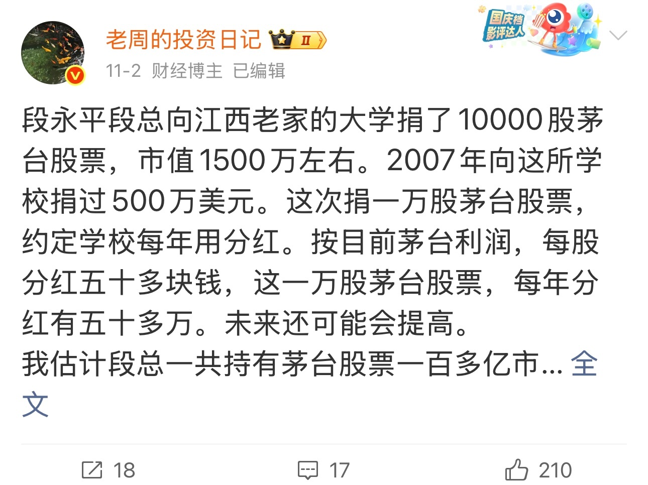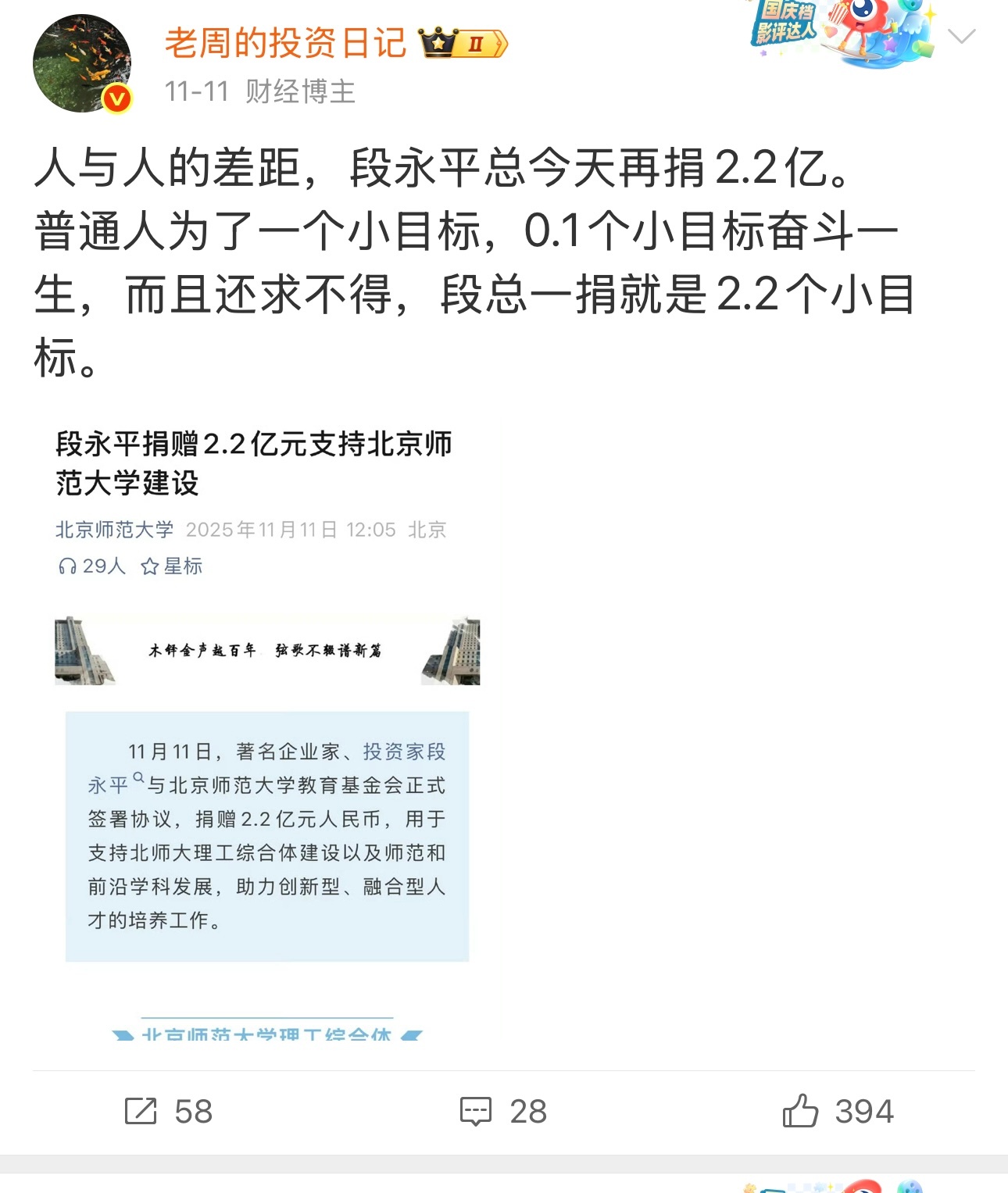我写微博表扬但斌总做慈善。有网友批评我说拍马屁,连大V都说我拍马屁。老周不理解,但总做好事了。我表扬他捐款做慈善的行为,怎么就成拍马屁了呢。别人做好事了,我们看到了,不应该表扬好人好事?我表扬但总,不是因为他微博也关注了我,更不存在拍马屁。很简单,别的著名人物捐钱,我看到了,我微博上也发出来表扬。11月2日和11月11日,我都发微博表扬段永平总捐款的行为。我发段总,总不存在拍段永平的马屁吧。他微博都没有,他可看不到我发的微博,更不知道有我这个人。