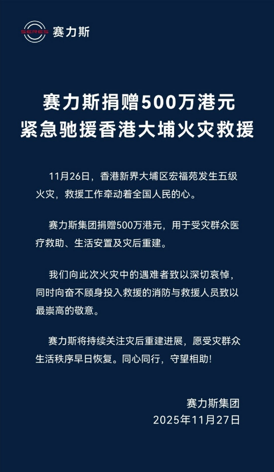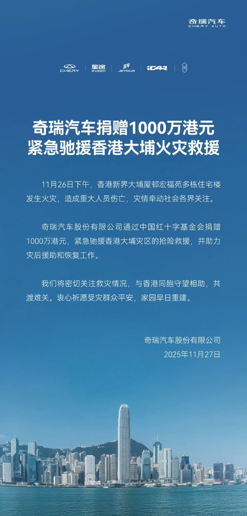奇瑞汽车捐赠1000万港元,紧急驰援香港大埔火灾救援。赛力斯捐赠500万港元,紧急驰援香港大埔火灾救援。