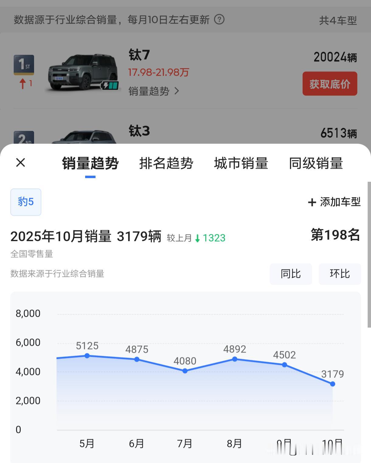 别看方程豹钛7销量这般生猛,上市第二个月就突破两万,实际上危机已然暗藏。比亚迪心里再清楚不过,钛7并未开拓出新的市场,全是内耗。 我们不难发现,竞品猛龙上个月依旧表现强势,而自家的钛3却受到了冲击,销量不断下滑,上个月,iCar V23实现了对钛3的超越。甚至在钛7发布之后,唐和豹5的销量也都有不同程度的下跌。 另一个危机在于,方程豹原本定位为25 - 45万的高端越野品牌,为了抢占方盒子市场,推出了承载式车身的钛3和钛7,这极大地损害了方程豹的品牌形象。其实比亚迪若想进军方盒子市场,完全可以把钛3和钛7归入腾势品牌,腾势本就是家用豪华品牌,若想走量也可放在比亚迪本品牌。方盒子若没有大梁,本质上仍是普通SUV,家用属性很强,将其归类到越野品牌实属不妥。