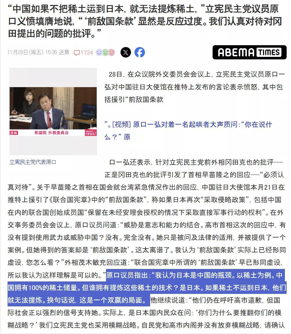 日本议员竟然认为中国的稀土完全靠日本提炼!只要日本不提供稀土冶炼,中国就会被卡脖子。并且还威胁,如果中国还持“敌国条款”的立场,那么日本就要对中国进行稀土制裁了。小八嘎的信息茧房太厚,而且是井盖焊死的那种。既然如此,那就是赶紧对我们进行稀土制裁吧,看看谁先扛不住。不得不说,愚昧比无知更可怕。烽火问鼎计划