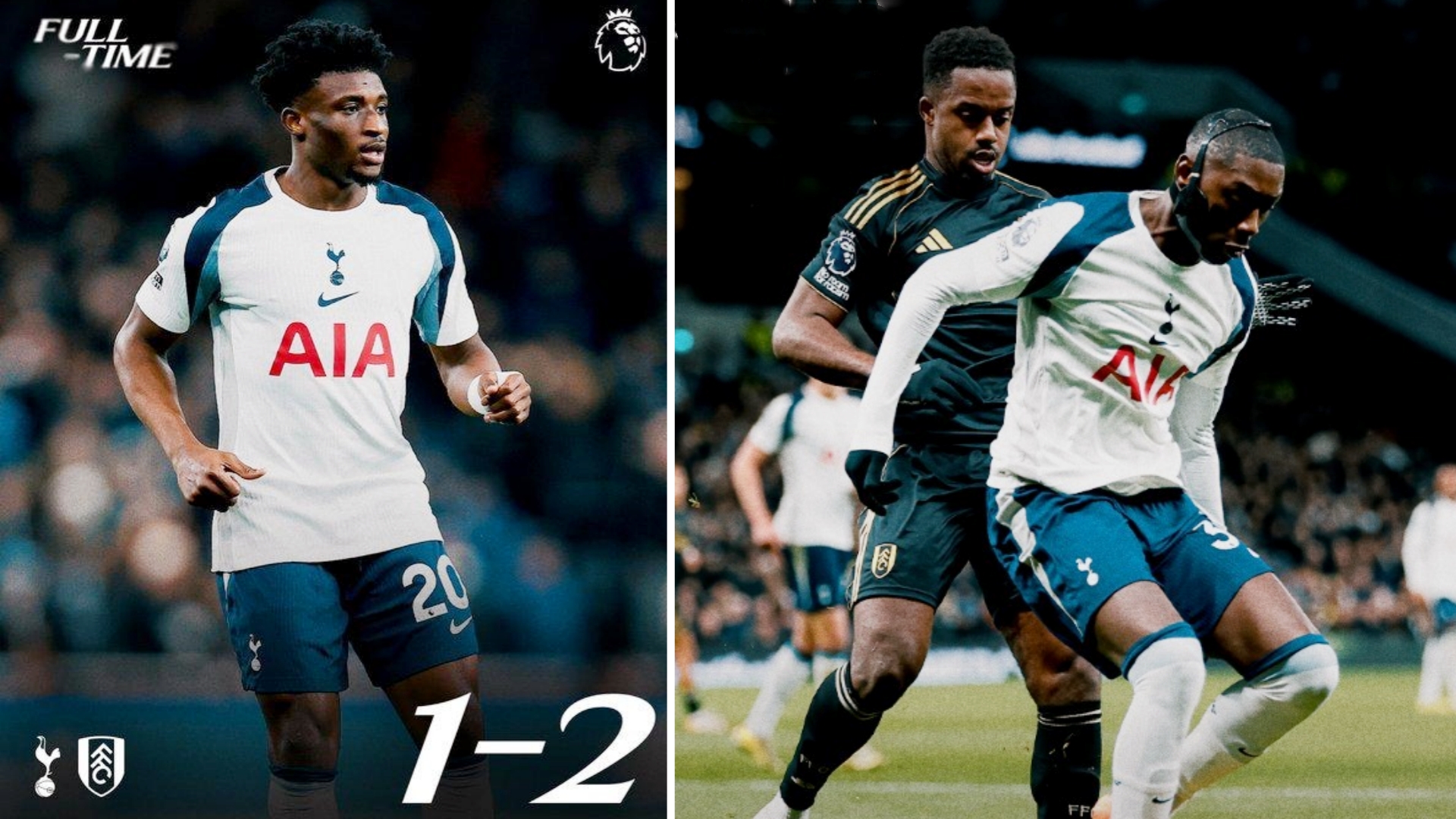 英超:热刺主场1-2负于富勒姆,各赛事四场不胜。 泰特与威尔逊开场两分钟打入2球,库杜斯扳回一城。