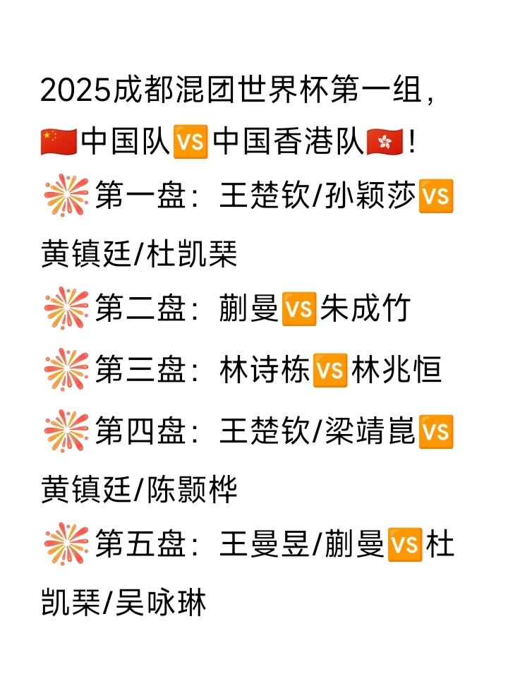 王楚钦/孙颖莎混双出战[奋斗]! 2025成都混团世界杯第一组, 🇨🇳中国队🆚中国香港队🇭🇰,双方排兵布阵阵容发布! 第一盘王楚钦/孙颖莎对阵黄镇廷/杜凯琹,对手实力也很强大,大头莎莎加油! 出战了混双就不能打单打了,所以蒯曼、林诗栋接下来出战单打,期待两人大比分完胜,不再展开男双比赛!