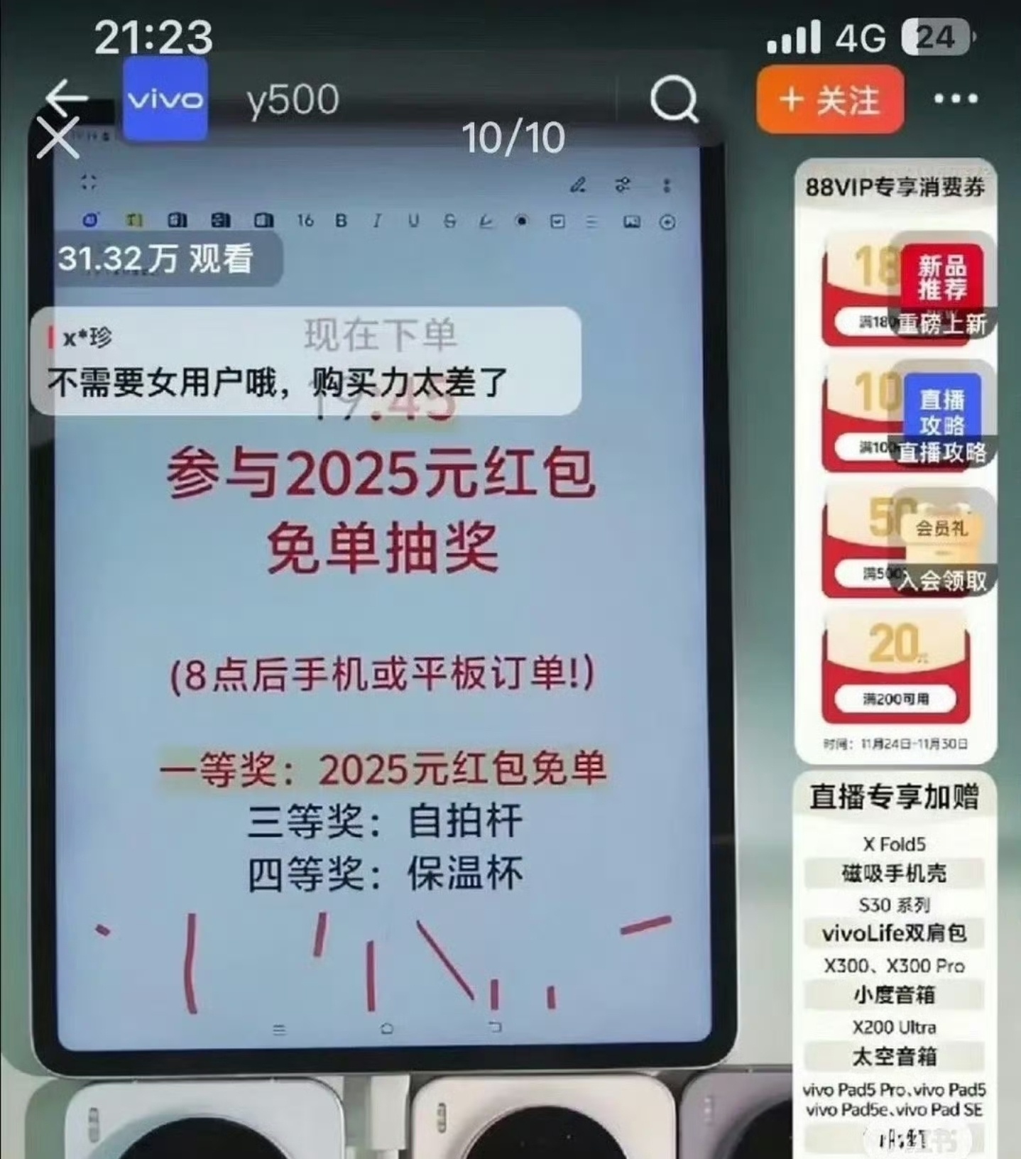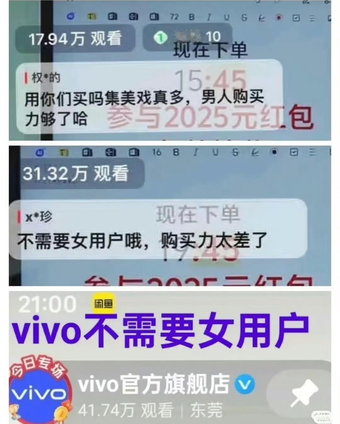 Vivo手机这个肯定是bug呀,主播和平台肯定不会置顶这样的留言。我身边很多女生都是买OPPO或者vivo, 反而男生很少,如果得罪了女性群体,这两个品牌估计要倒闭吧。